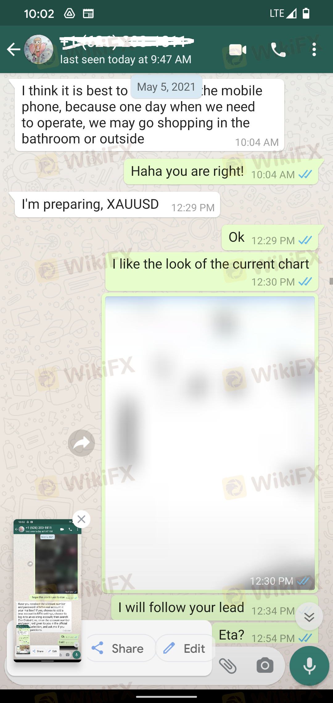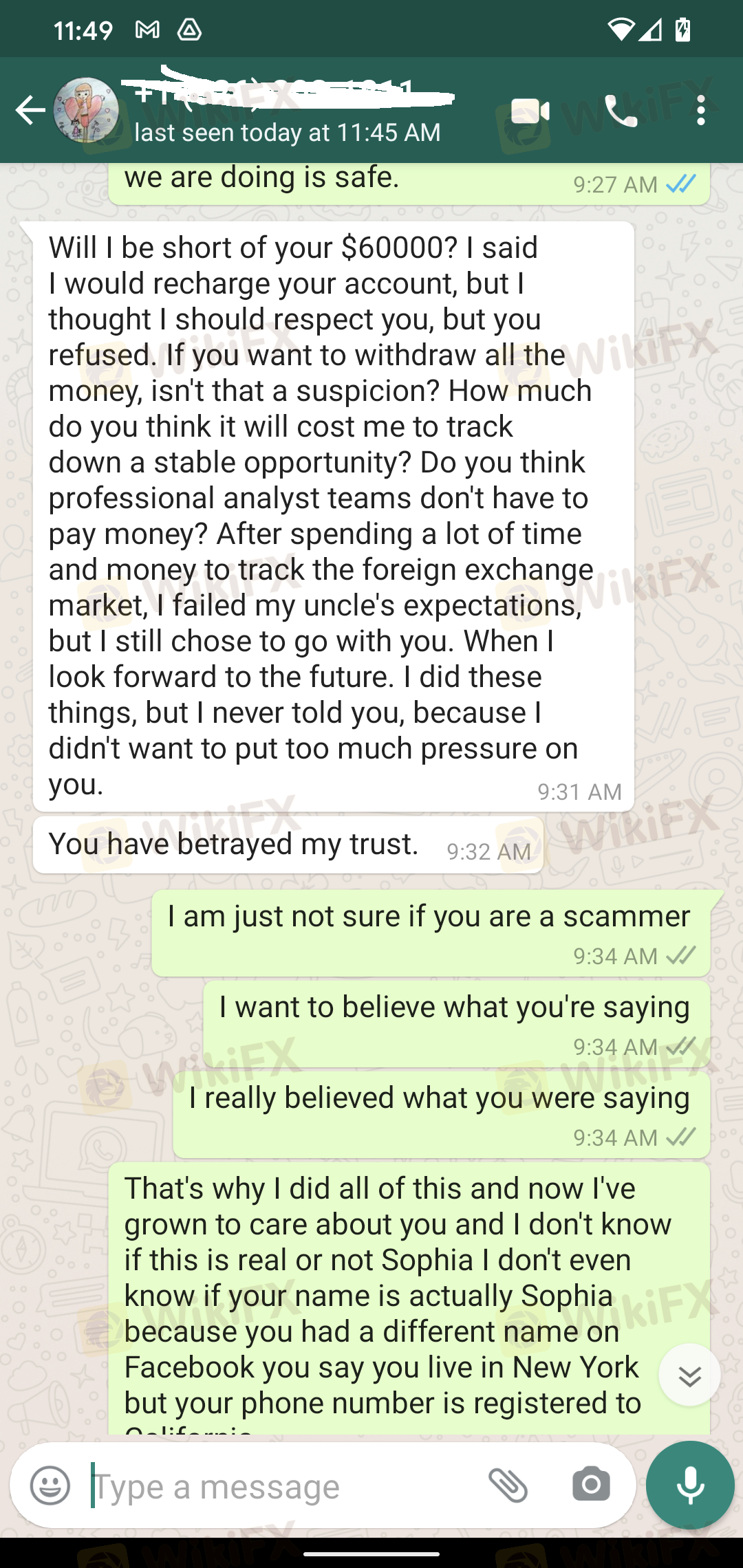 تم الاتصال به على الفيسبوك. نبني صداقة بعد بضعة أسابيع ، ذكرت استثماراتي في التشفير. عرّفتني على الفوركس وبدأنا العمل معًا. لقد حققت ربحًا وطلبت سحبًا صغيرًا وتم منحه ولكن تم الحصول عليه من خلالها. ليس لدي طريقة للاتصال بخدمة العملاء مباشرة. طلبت سحب الحساب بالكامل وقالت إنني خنتها. في انتظار لمعرفة ما إذا كنت سأحصل على أموالي. لقد تم خداعي