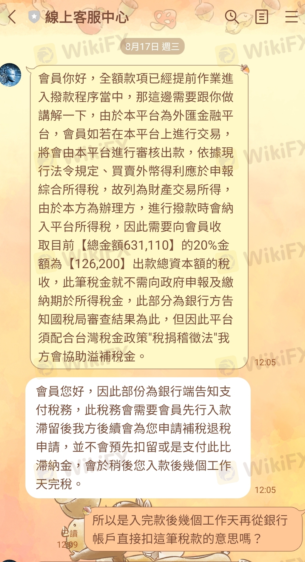 要出金的時侯說金額超過50萬要先繳納稅金才能完成領取,繳完之後客服就完全不回應了!去問當初接洽的專員,說幫忙查詢結果直接刪除所有的聊天記錄直接人間蒸發!