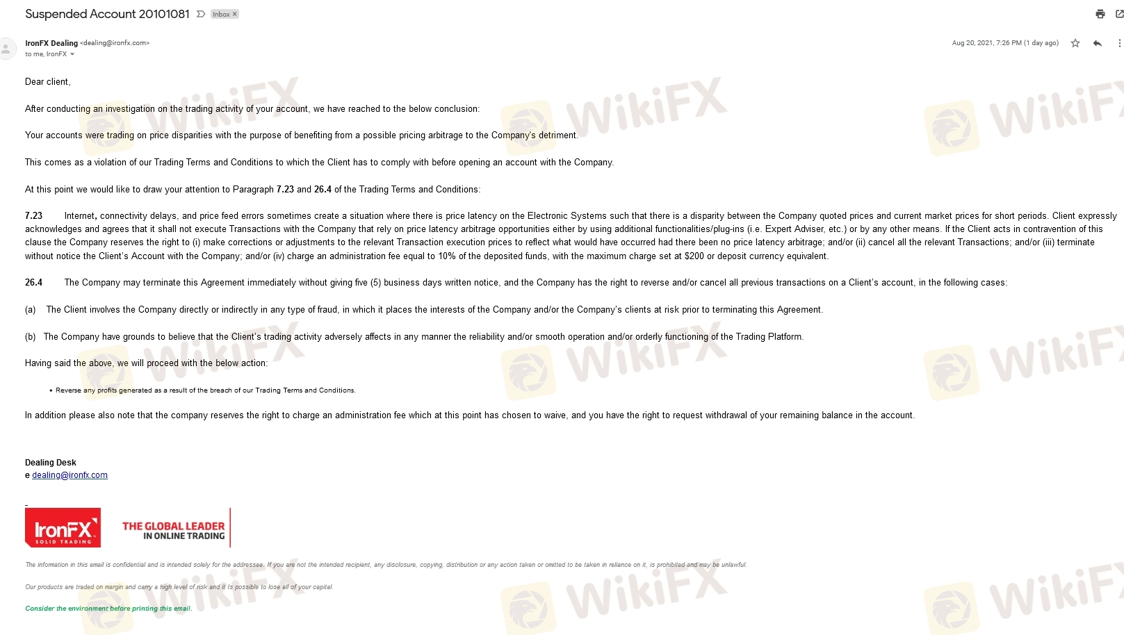 Funded: 100$ 19th Aug 2021 Profit Made 251$ 20th Aug 2021 Received Mail from IronFX stating that my account is suspended and Profits Reversed : 20th Aug 2021 8:00 PM Checked my Account and Observed that all profits have been Reversed : 20th Aug 2021 8:15 PM