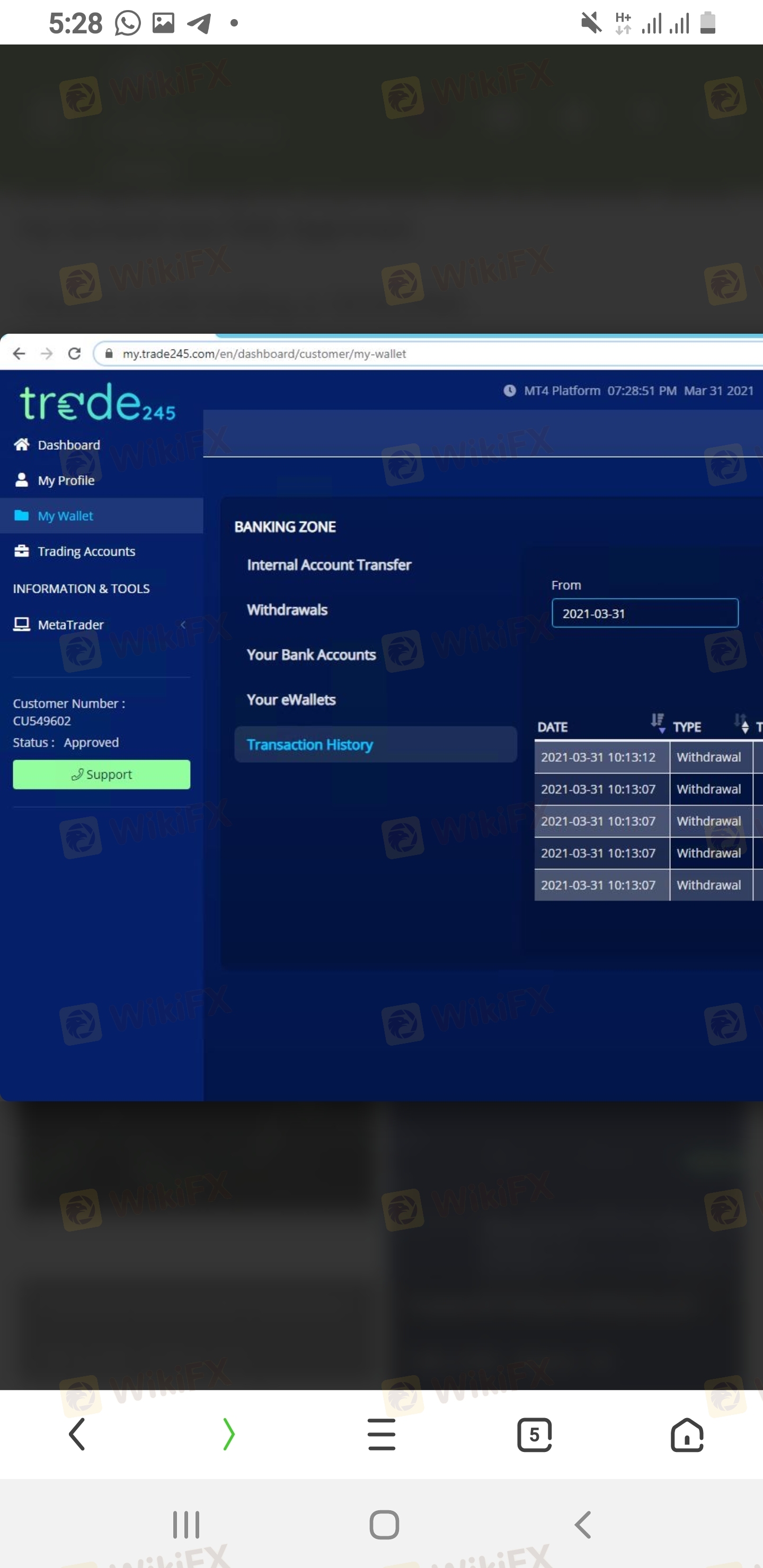 My first withdrawal requested date on 23-03-2021 they rejected and asked me to provide documents. which i have already provied and that Approved Again i requested on 25-03-2021 that rejected and got email from company to request withdraw on Skrill instead of Bankwire. Again I requested withdrawal on 26-03-2021 , 29-03-2021 then 01-04-2021 All rejected without any carouse.