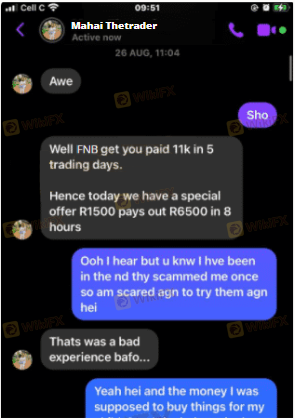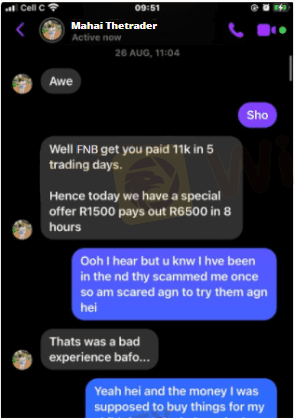 I was scammed by a person called mahai thetrader he told me he is a FNB trader and I can earn 6500 in a day in need to pay 3500 but I told him that I don’t have that money .I only have 2000 rand then he decided to tell me that it fine then he told me that the money will reflect tomorrow .but after i tranfer the money to him Mahai just doesn't answer me anymore.