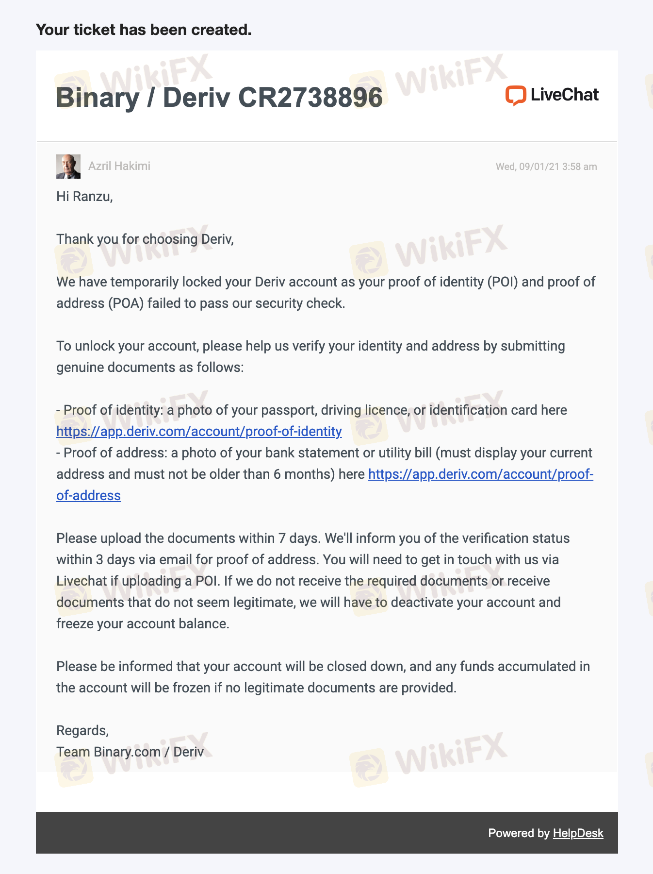 DERIV when I request the money as an IB they blocked my wallet not letting withdraw. After my identity verified they ask proof of address, I send 3 different and they refuse all 3, saying they can t accept please send another. After I ask on live chat why they dont accept they say bad quality, I made perfect photo and send again they block my account with 12000$ and say they will not pay me! VERY BIG SCAMMER, dont trade on Deriv or you will never see your money! I see they do this everyday, please contact regulators so we can stop this scam and have our money back!!! my costumers also dont get paid profits. RUN AWAY OF THIS BROKER
