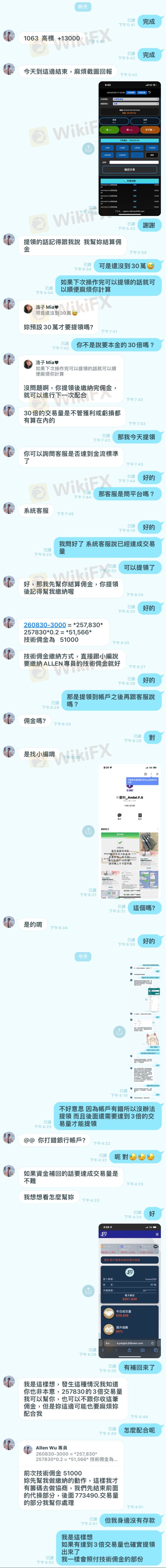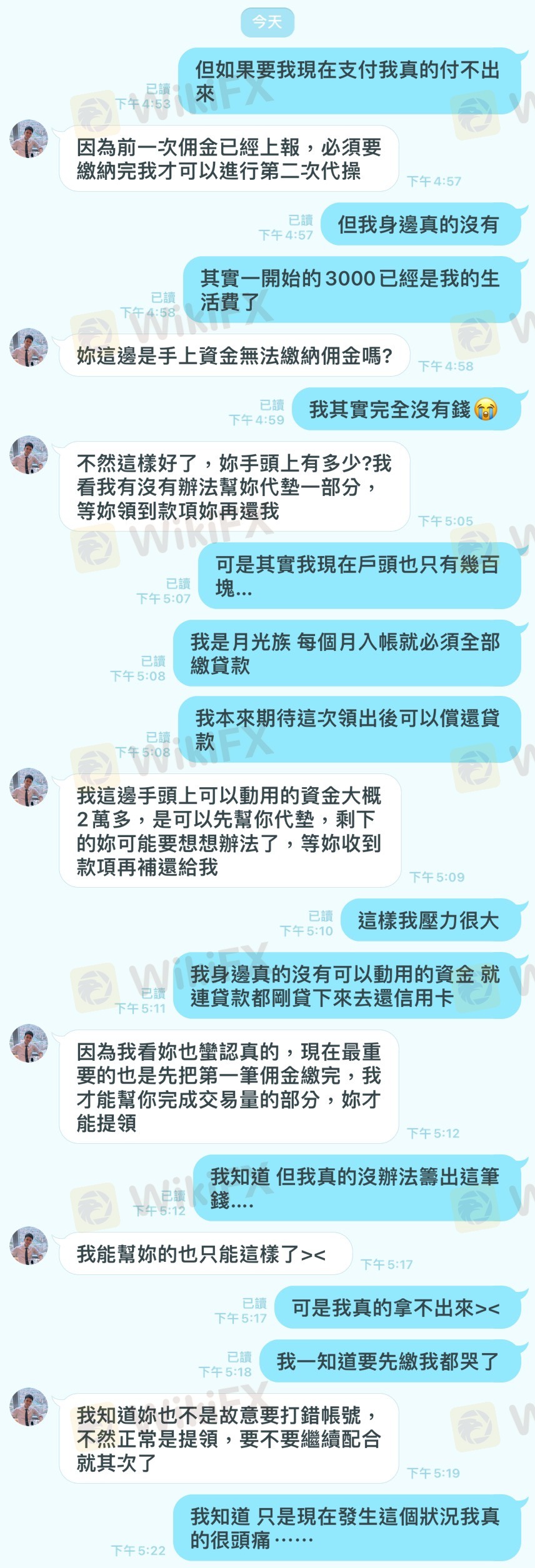 一開始只是想要找其他方式增加自己的收入 後來看到FB有廣告 之後就加入line官方帳號 一開始是小編要我用火幣操作入資3000 後來是系統客服開通平台帳號 接著找一個專員代操 然後說有送回饋金7000 但要能出金要本金的30倍才能出金 也就是10000的30倍 接著都會不定時有預約代操 直到昨天代操結束後專員說可以提領了 我就在平台提供帳戶 客服說過了銀行營業時間 於是今天處理 但後面說金控部門說帳戶填錯無法出金 原本的獲利會返還 但要在操作到3倍的交易量才可以出金 說我可以請專員協助 然後我也跟專員說 專員就說可以協助 但前面的技術佣金要先支付 總共要51000 如果沒有先支付就沒辦法進行下一次代操 我跟他說我身邊沒有錢 結果他說不然他可以先幫我代墊兩萬多 剩下我處理 然後繳納之後再繼續操作 我也一直說我沒有辦法繳納 我就只是個月光族 債務也一堆 雖然目前就這樣不了了之 但我很擔心我的帳戶會出事