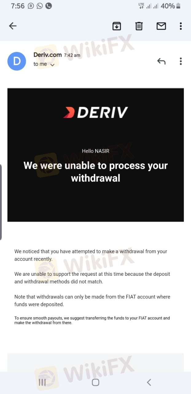 Deriv seems to be a be a suspicious Broker, They accept My deposit and permit me to get my first withdrawal within 24 Hours. I thought it was a good broker to trade with, therefore I added much money in to my trading account, but the next time I applied to withdraw my funds, then the continued to decline the request and saying that the withdrawal method doesn't match. which is the same withdrawal method I got my first withdrawal. please help me get my money