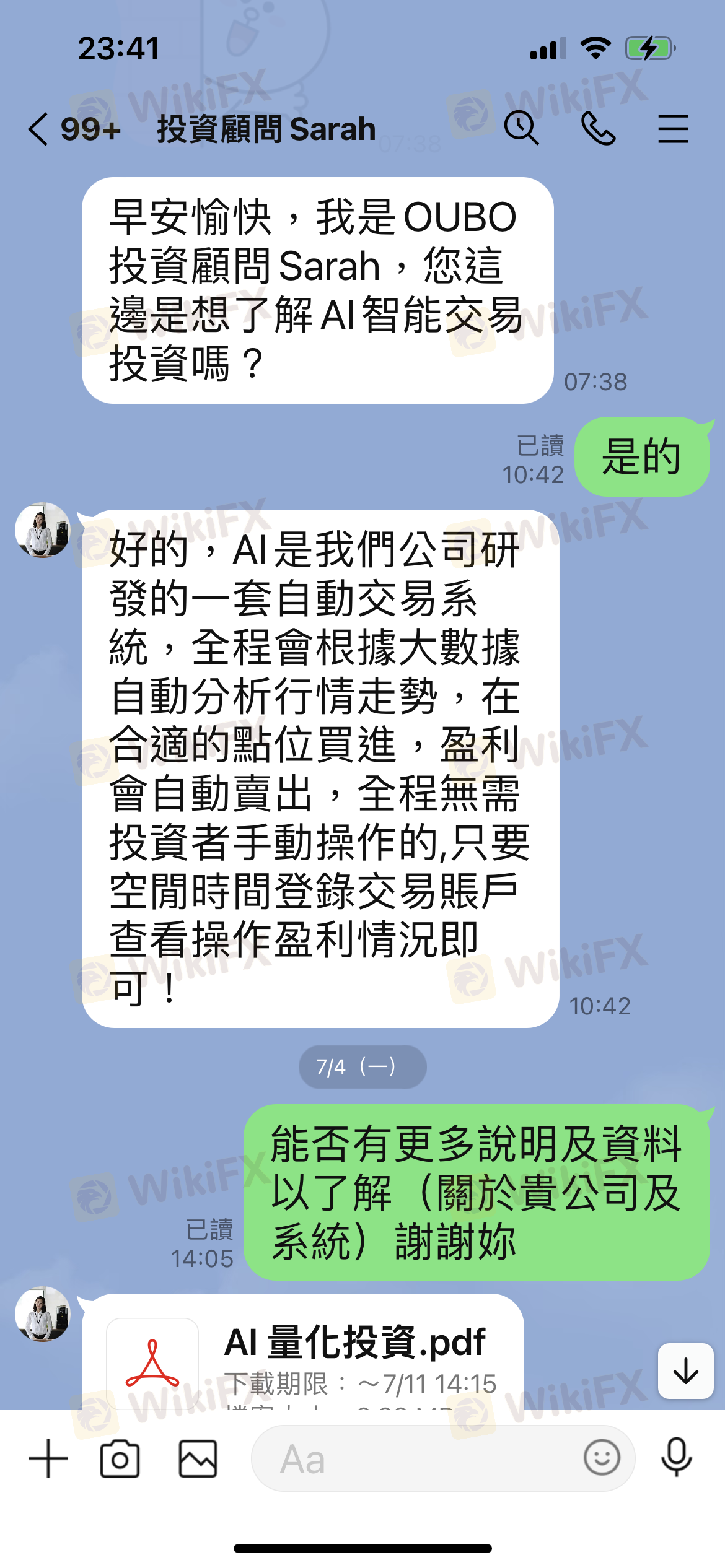 Oubo 不實廣告,大打他們的AI智能投資,屬於穩健獲利型,最重要的是風險把控為首位,誘騙投資者先加入體驗,等加入一個月後才告知必須增加資金到3萬美元,才能加入正式版AI,但先前從未告知什麼體驗版及正式版。第一個月先小手數操作,讓你少量且穩定獲利,一個月後就不斷鼓吹加金才能加入正式合作。我評估過後無法再注金,所以被告知只能繼續用體驗版,結果AI智能操作突然加大手數到3去交易,且未設止損,直接讓你爆倉。