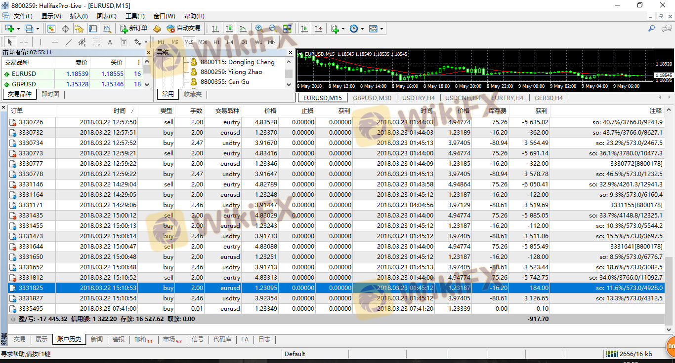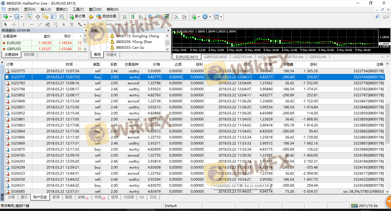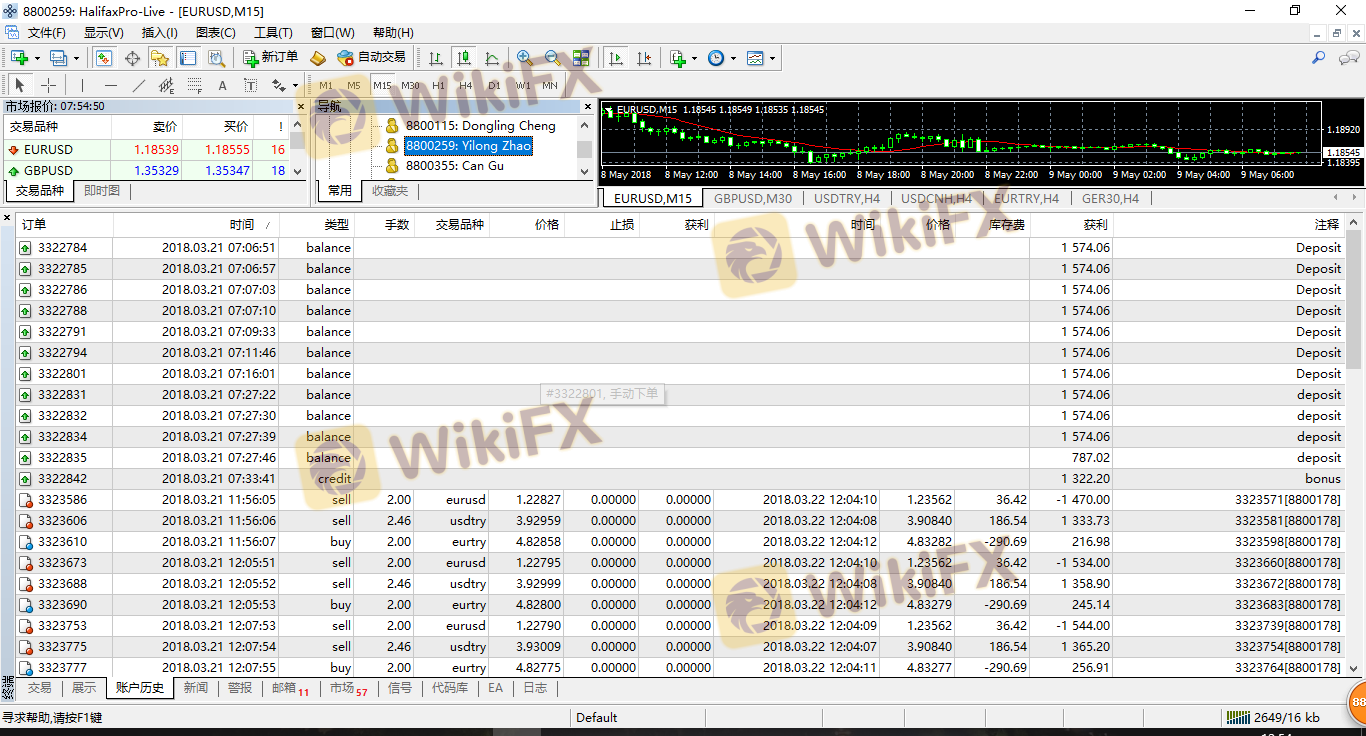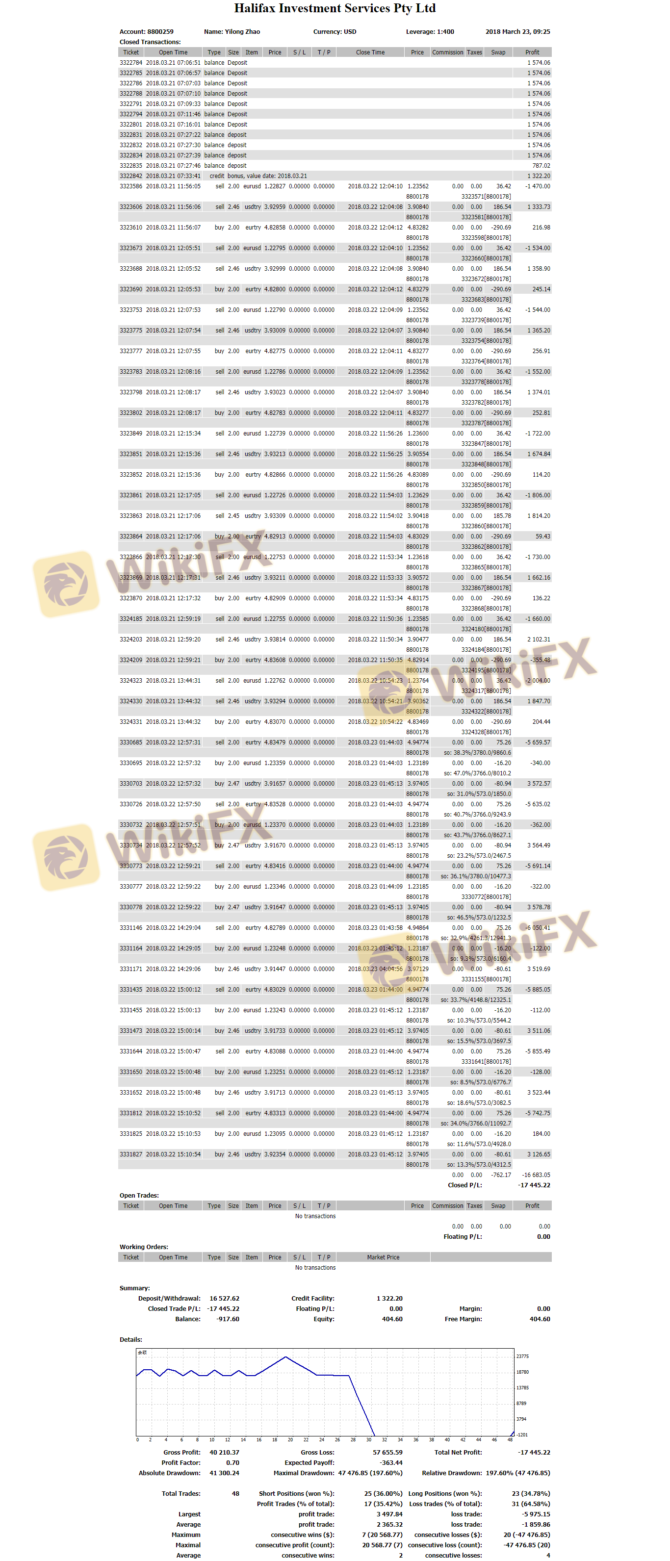本人于3月初在halifax外汇平台开通个人交易账户,并从事外汇保证金相关交易。期间其销售人员联系本人以赠金8%方式诱导我大量入金,当时我对很多品种都有交易,也有锁仓处理,在3月23当天点差在没有特大行情的情况下无故扩大了几十倍,导致我的单子直接爆仓,损失严重!相对于其他平台当时点差波动来说halifax外汇平台明显是人为操作导致点差无限扩大,已经超出了浮动点差的范畴。事后平台也没有对这件事有任何解释,只是告知是客户自身操作技术问题。 halifax外汇交易平台存在非法隐瞒投资风险,夸大投资收益,故意反向操作,诱导下单,开始用赠金诱导,然后入金做单之后无故扩大点差,导致单子直接全部爆仓。