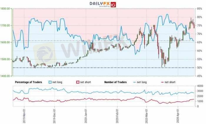 A summary of IG Client Sentiment shows traders are net-long Gold- the ratio stands at +1.72 (63.26% of traders are long) – bearishreading