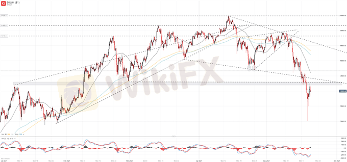 Bitcoin may be vulnerable to further losses and volatility as risk appetite waned and cryptocurrency sentiment soured throughout the week. Price action has seen BTC/USD crater beneath multiple levels of support as corporations walked back their adoption plans and major exchanges had outages. The series of fundamental headwinds highlight the relatively young state of the cryptocurrency market and the immense volatility that can follow in times of uncertainty.