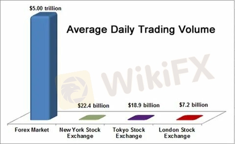 It is the largest financial market in the world with a daily turnover of $5 trillion! It is huge even when compared to the biggest stock exchange markets. Check the chart below.