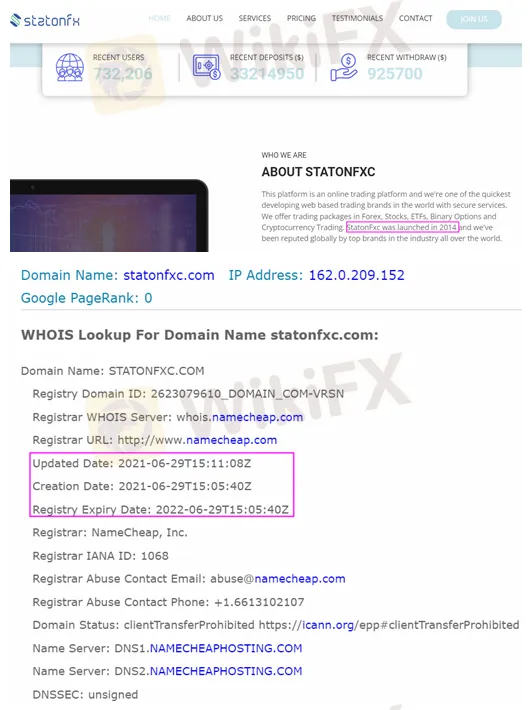 The entity shows it was launched in 2014 and has been reputed globally by top brands in the industry all over the world. However, domain check results showed its domain(https://statonfxc.com/) was newly created in June 2021.