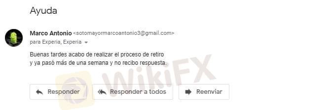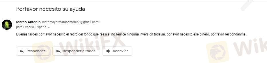 Deposite $300 dólares al broker, ya que ellos me ofrecían ganancias casi al instante, poco después de hacer el depósito investigué sobre el broker y me di cuenta que ya habían estafado a más gente, en ese momento intenté retirar mi dinero , como no llegaba entonces empeze a enviar correos solicitando mi rembolso, envié los córreos a sus correos de soporte ( experiamarkets2021@gmail.com , support@experiamarkets.com) hasta ahorita no me ha llegado el retiro!