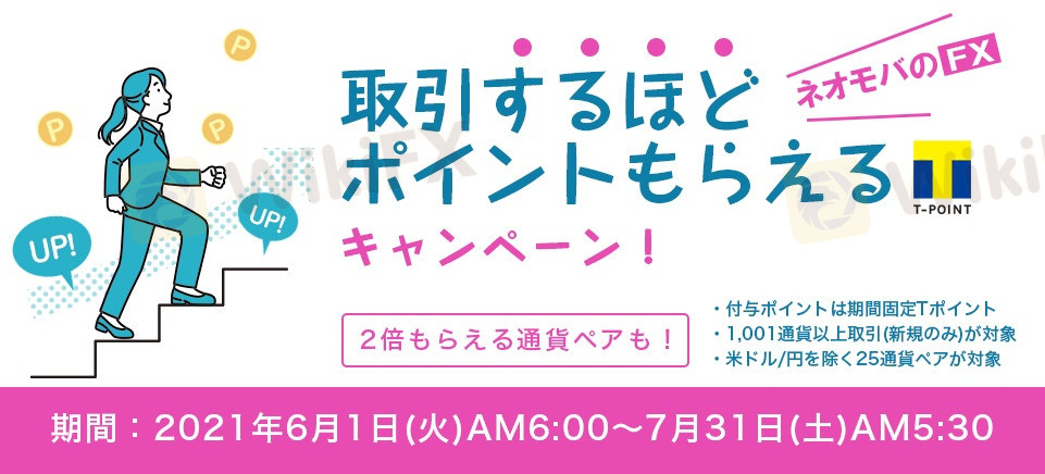 SBIネオモバイル証券が提供しているFXサービス、ネオモバFXでは6月1日~7月31日まで限定で取引するほどもらえるポイントプレゼントキャンペーンを開催中。 対象期間中月間取引数量に応じてTポイントをプレゼント ・新規100万通貨以上:1万通貨当たり5ポイント ・新規50万通貨以上:1万通貨当たり3ポイント ・新規1万通貨以上:1万通貨当たり2ポイント ※条件:1,001通貨以上の新規取引、米ドル/円を除く25通貨ペア