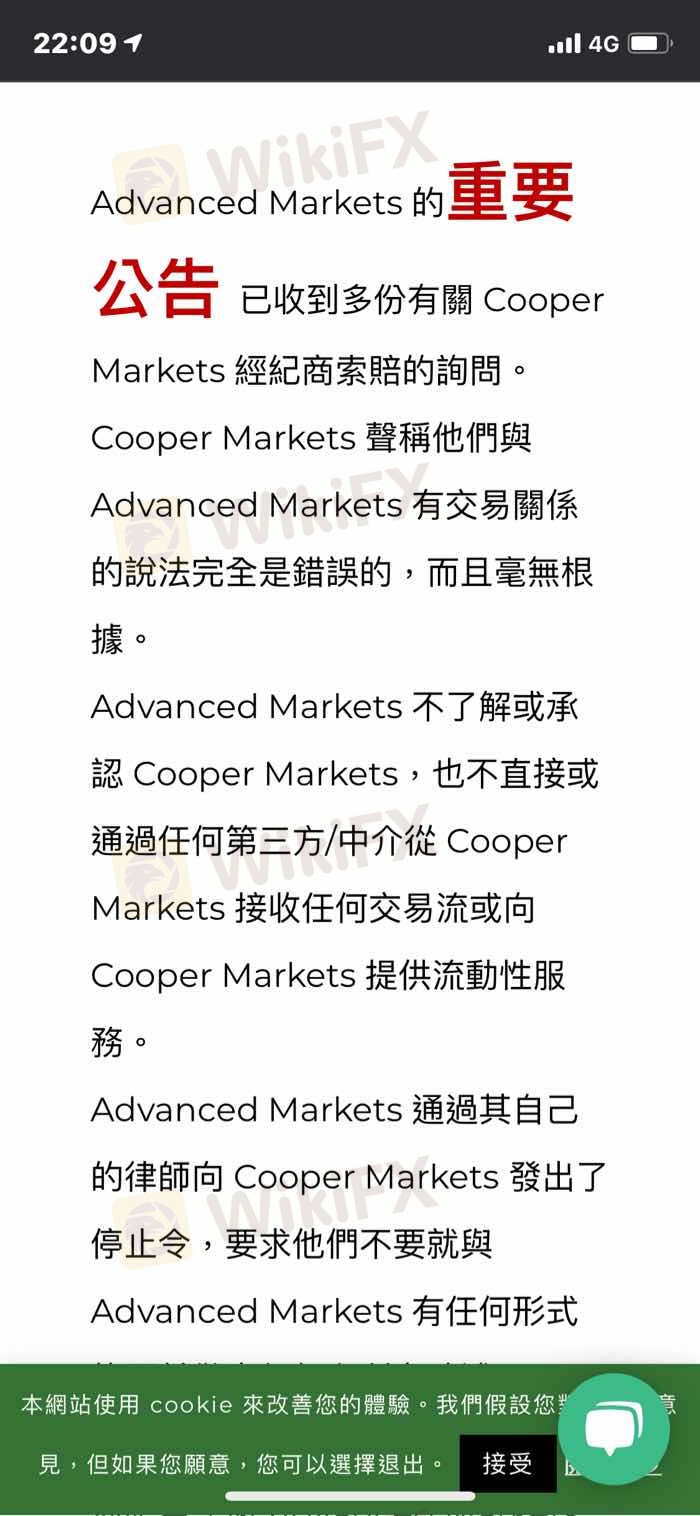 這是一個資金盤,資金根本沒有到流量商,還公告是流量商問題,向流量商發律師函,但是流量商根本沒有承認Cooper Markets, 現在負責人無出面回應,錢包的資金也無法領出!