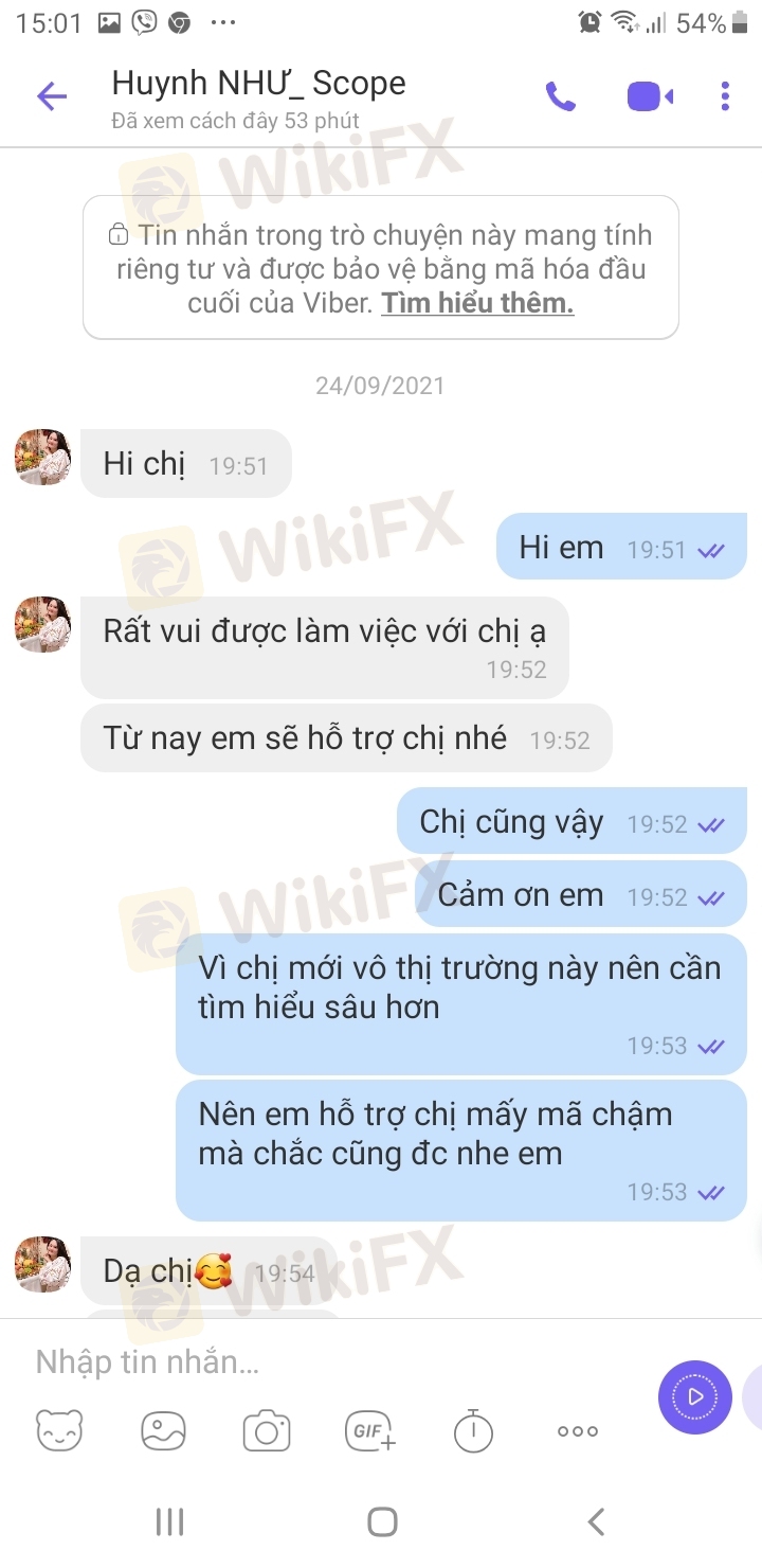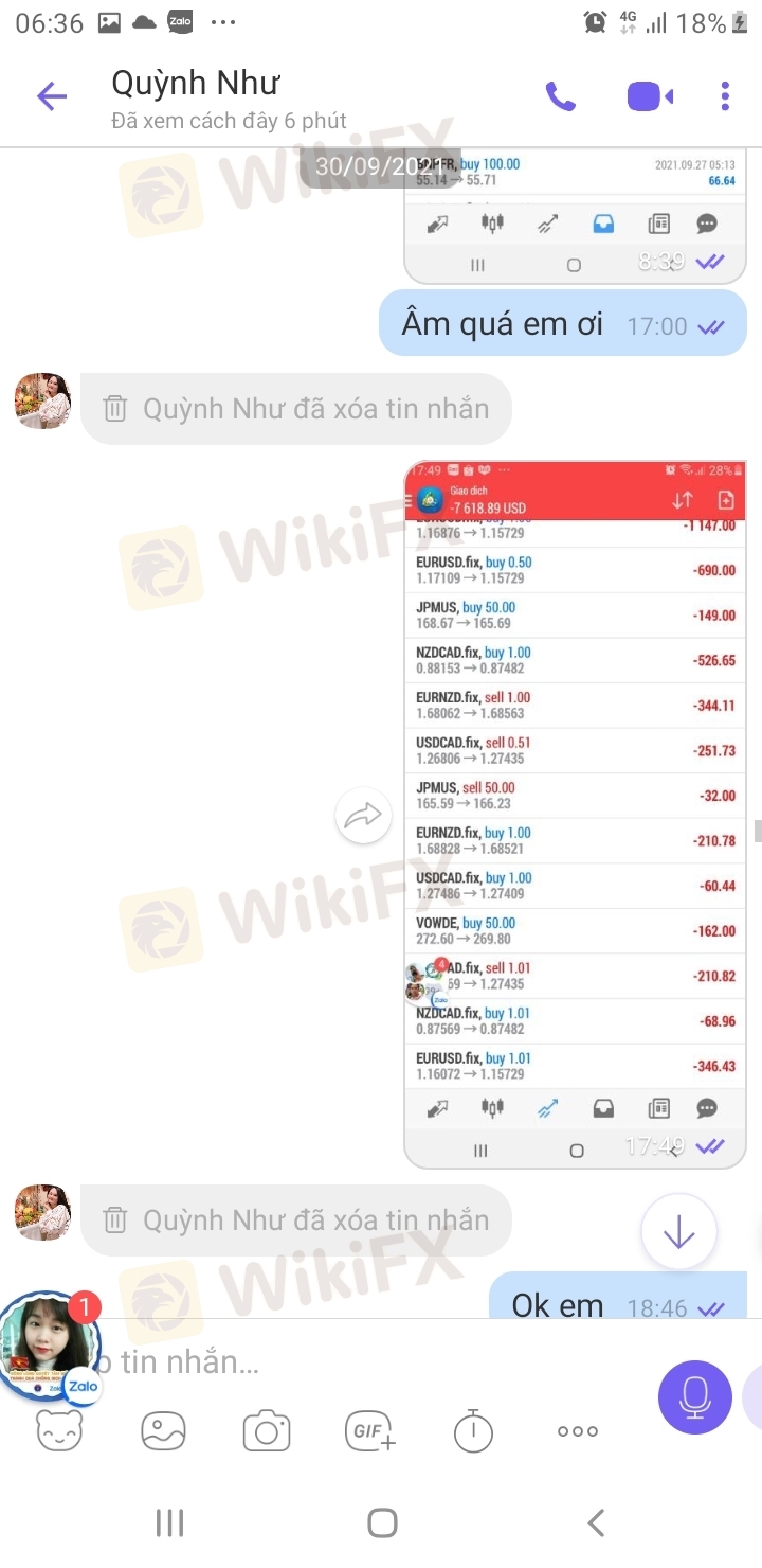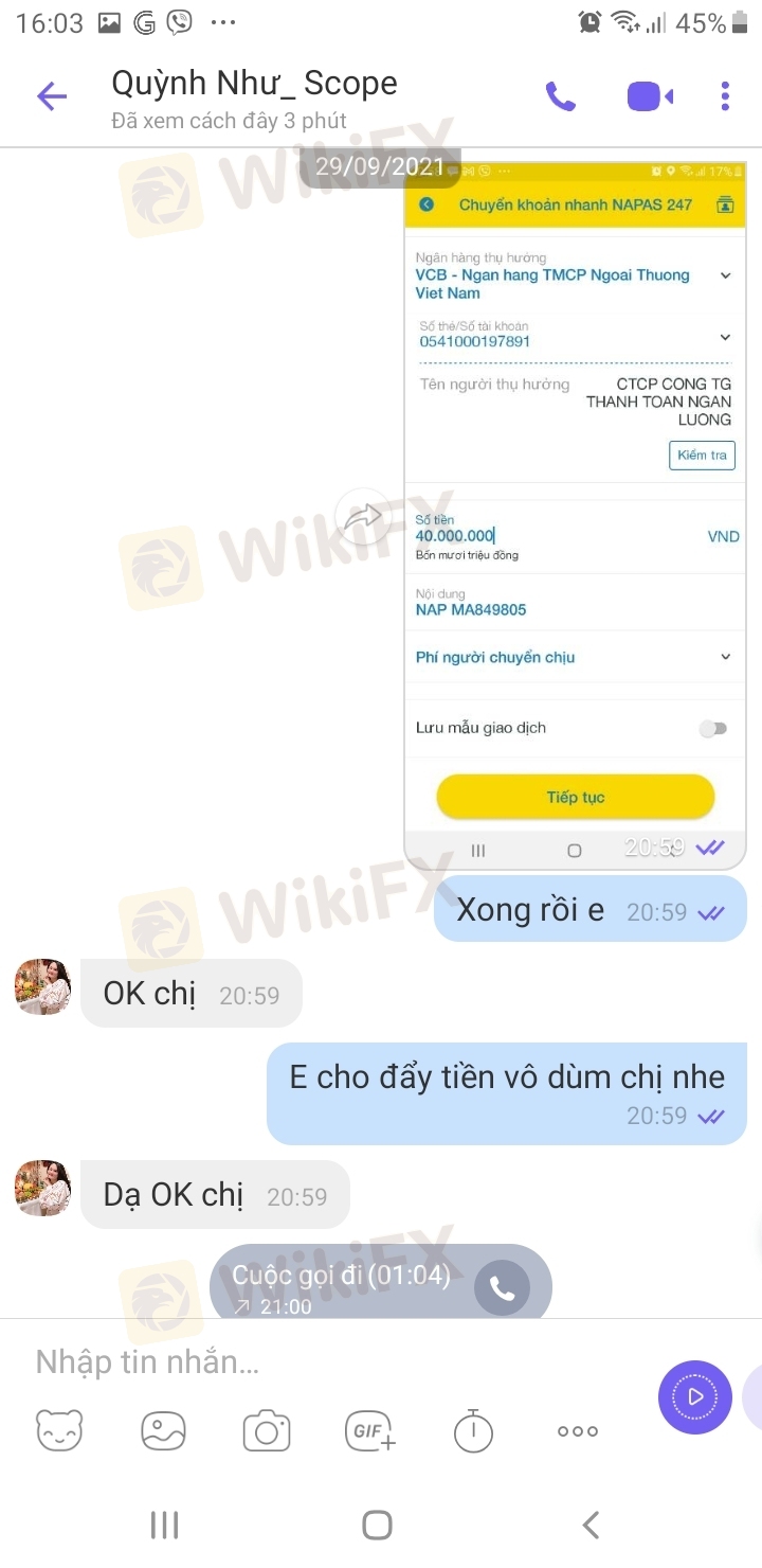 Staf dariScope Markets lantai adalah Phi Hai Linh di 0866.232.038 dan Quynh Nhu 0374169005; 0846663224 membujuk saya untuk bergabung dengan saham. Di mana, Quynh Nhu, yang diperkenalkan oleh bursa sebagai ahli, memimpin dan membacakan perintah bagi saya untuk berinvestasi dalam pasangan mata uang asing. Seperti biasa meyakinkan saya bahwa tidak apa-apa untuk mengikuti instruksi Nhu, dan hanya dalam satu minggu dari 24 September 2021 hingga 1 Oktober 2021, saya menghabiskan 86 juta dong Setelah melihat bahwa saya tidak dapat menghilangkannya. uang mereka segera mendorong saya keluar dari grup zalo