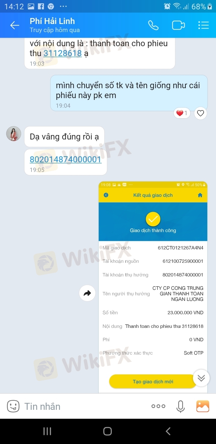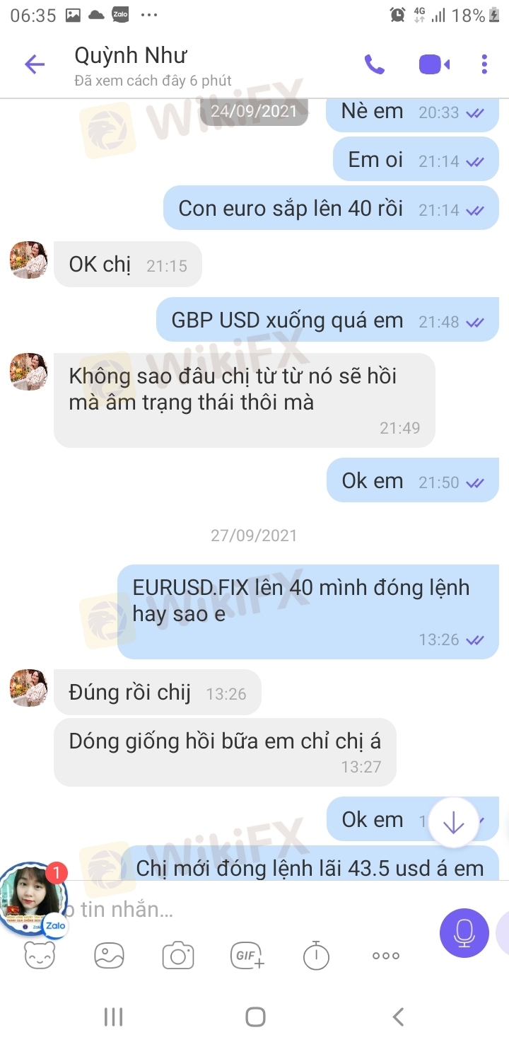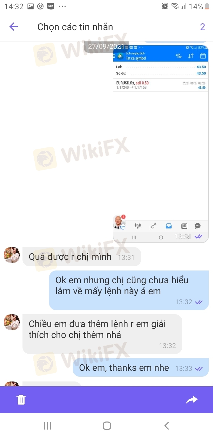 Staf dariScope Markets lantai adalah Phi Hai Linh di 0866.232.038 dan Quynh Nhu 0374169005; 0846663224 membujuk saya untuk bergabung dengan saham. Di mana, Quynh Nhu, yang diperkenalkan oleh bursa sebagai ahli, memimpin dan membacakan perintah bagi saya untuk berinvestasi dalam pasangan mata uang asing. Seperti biasa meyakinkan saya bahwa tidak apa-apa untuk mengikuti instruksi Nhu, dan hanya dalam satu minggu dari 24 September 2021 hingga 1 Oktober 2021, saya menghabiskan 86 juta dong Setelah melihat bahwa saya tidak dapat menghilangkannya. uang mereka segera mendorong saya keluar dari grup zalo