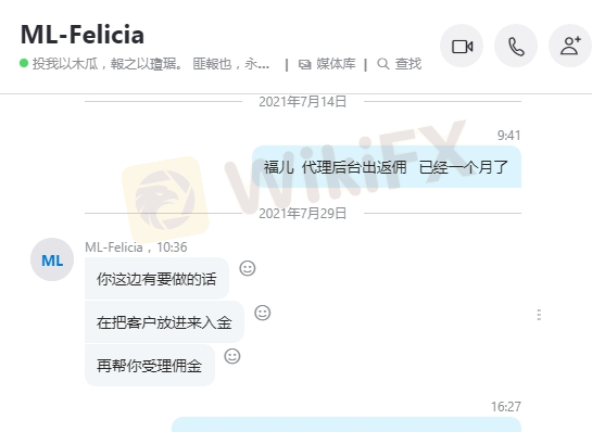 联准国际业务总监Felicia 诱导欺诈客户,客户没有违反任何交易机制,当月爆仓了几万美金,只剩下几百美金,出金最后的几百美金,Felicia卡着不给出金,说有入金后才会给办理出金,有入金后,申请出金时,Felicia又卡着不给出金,又让入金,让有新的客户后再给办理出金。当月整体的入金是出金的几十倍,爆仓后申请最后一笔出金,Felicia一直卡着不给办理,Felicia 为了自己的业绩,在客户满足平台的要求后,一直卡着最后一笔出金,不给办理。申请让平台查询所有的出入金数据并申请更换客服经理,Felicia看到查询数据及更换客户经理的邮件后,直接把后台封了,Felicia是联准国际的管理层,为了自己的业绩,客户满足平台的要求后仍不受理,不跟她个人合作,申请换个客服经理,Felicia直接关闭后台,管理层尚且如此,下面的员工也会效仿。最后的一笔出金永远到不了。希望其他客户以及代理不要相信联准国际台湾业务经理的任何承诺。以及MOGA台湾业务经理的任何承诺,以免也上当受骗。