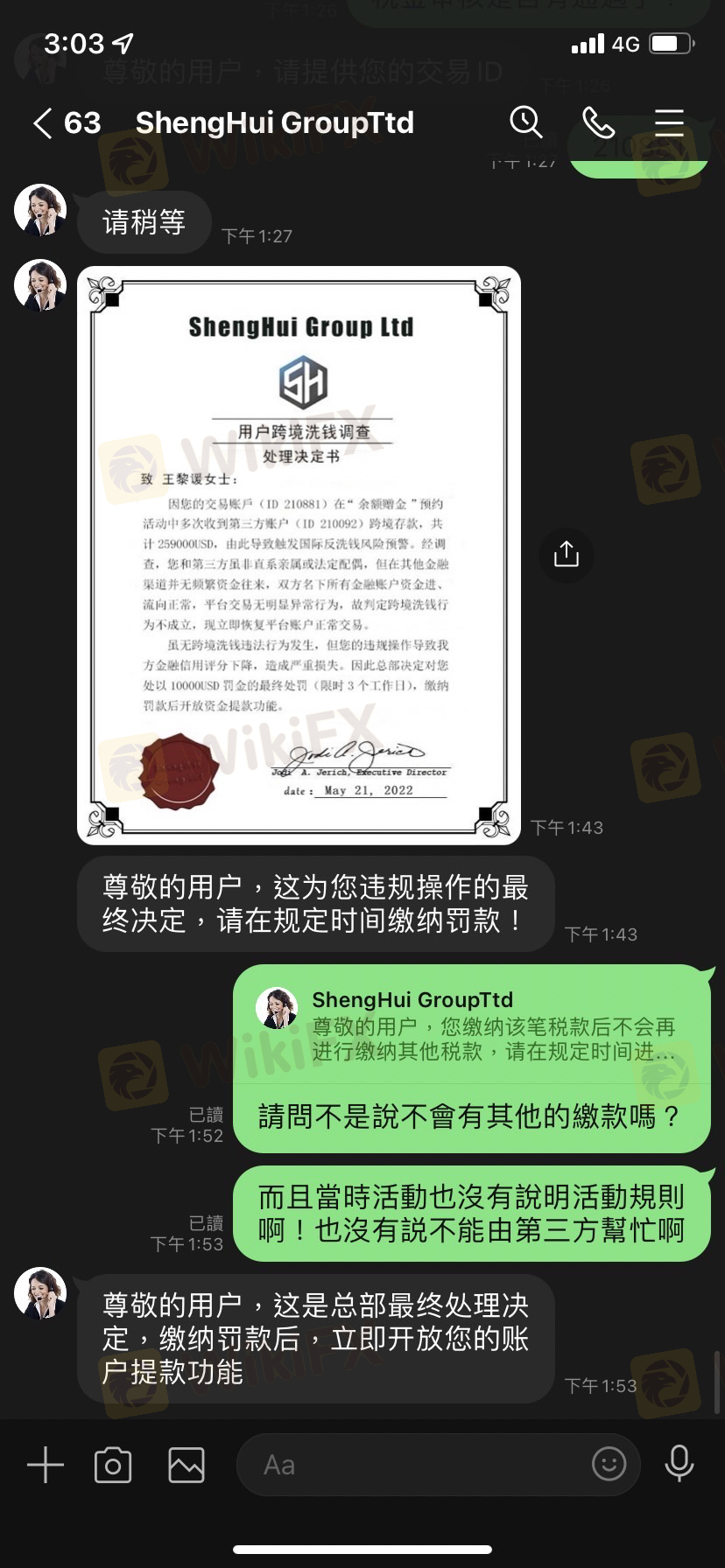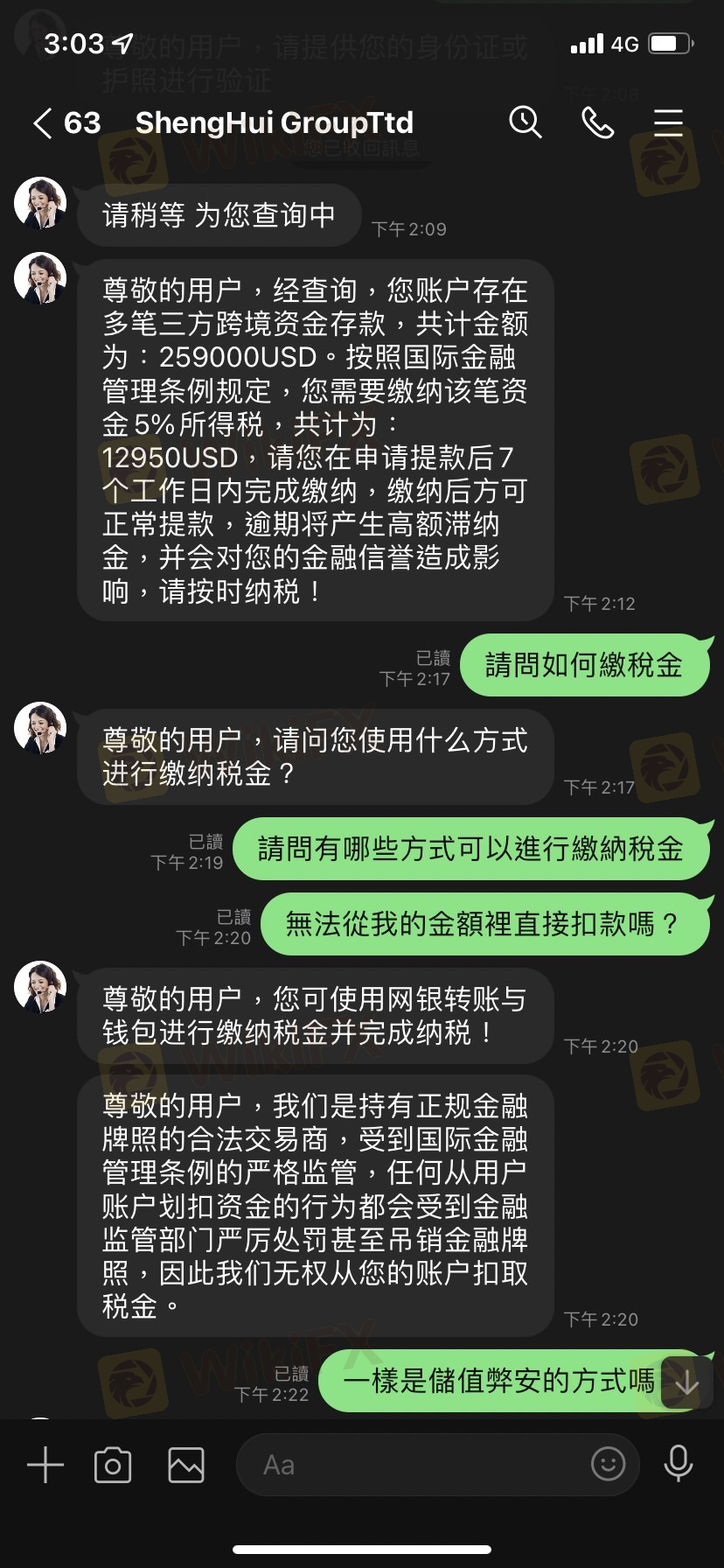 我近期投資一個平台,ID: 210881,在網路上認識的人,要我參加他們的活動,儲值30萬美金贈送3萬3美金,他說會一起幫我完成,當時活動內容也沒有說明活動規則,然後我就跟朋友一起完成儲值任務後,客服人員說:「您账户存在多笔三方跨境资金存款,共计金额为:259000USD。按照国际金融管理条例规定,需要缴纳该笔资金5%所得税,共计为:12950USD,请您在申请提款后7个工作日内完成缴纳,缴纳后方可正常提款,逾期将产生高额滞纳金,并会对您的金融信誉造成影响,请按时纳税!」 依照台灣正常來說,稅金都是直接扣除後再給剩餘的錢(而且我也上網查過了),所以我要求從裡面扣除稅金 客服人員卻說:「我们是持有正规金融牌照的合法交易商,受到国际金融管理条例的严格监管,任何从用户账户划扣资金的行为都会受到金融监管部门严厉处罚甚至吊销金融牌照,因此我们无权从您的账户扣取税金。」 無奈之下我只能繳稅金,也詢問過客服是否只有這一筆繳款,客服也說是,繳完稅金後客服人員卻說總部覺得我有洗錢的嫌疑,但經過調查我沒有洗錢,卻損害他們的名譽,要罰款一萬美金,問題是一開始也沒有告知遊戲規則,然後又說我損害名譽,也拿不出損害名譽的證明,也不知道罰款金額是怎麼算的,我不知道如果繳完罰款後又會拿什麼理由一直要我繳款不給我提款,然後那位網友一直不斷要我投錢進去,還帶有一點威脅,但我真的沒錢也不願意再投錢時,他人也跟著消失了,希望大家不要再跟我一樣受騙