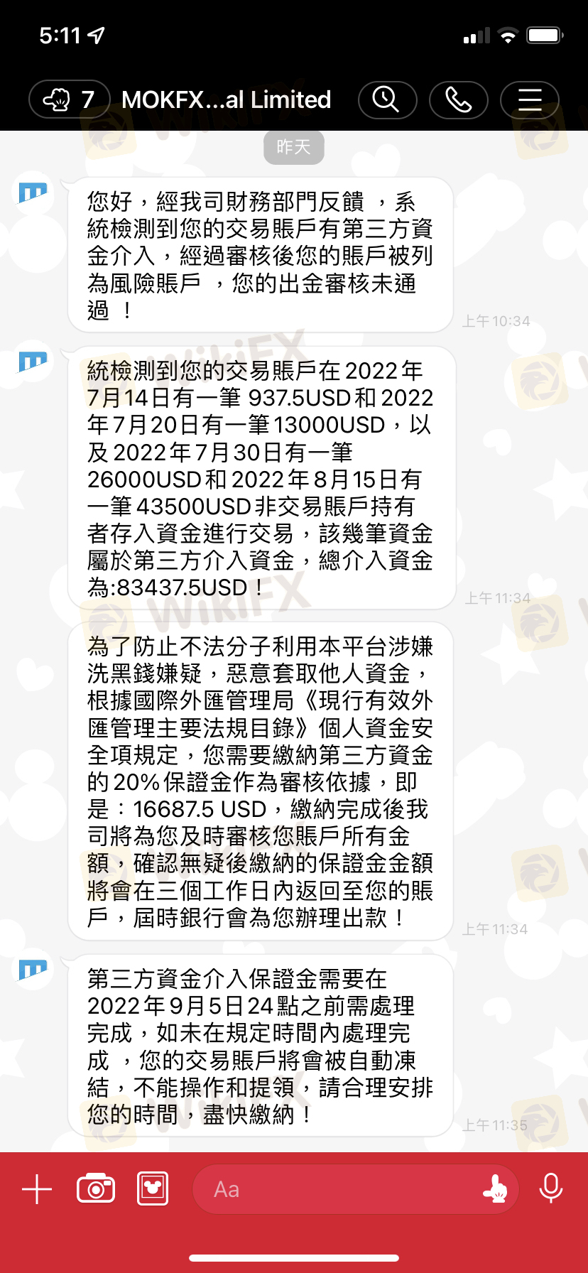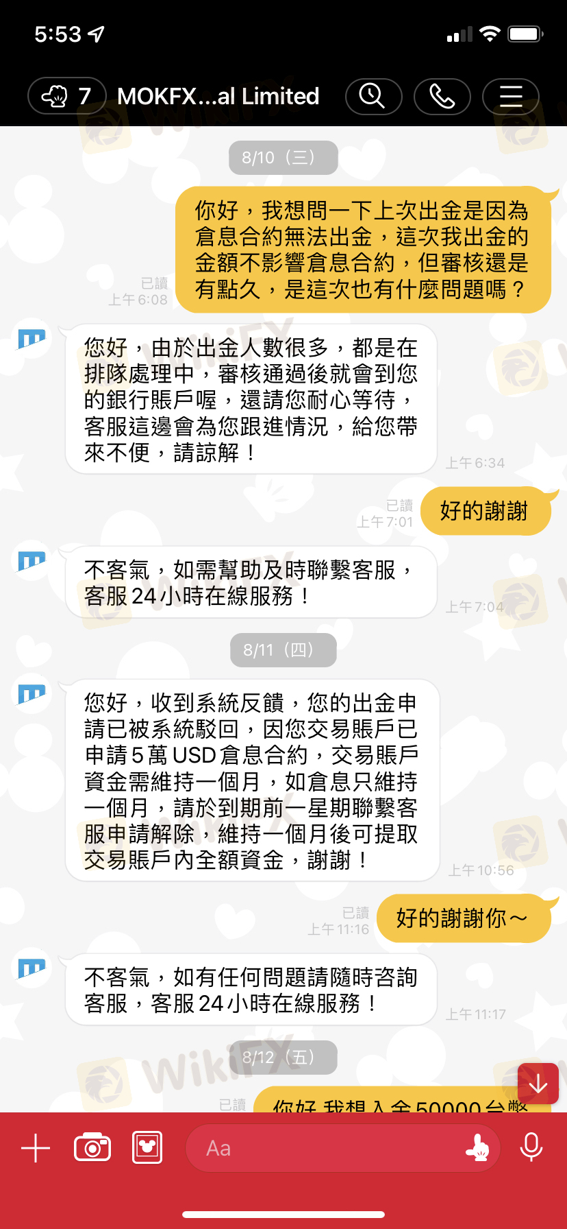 在網路交友結識一位男子,先是慢慢建立信任和感情基礎,再以結婚基金為由,說他的叔叔是這方面的專家穩賺不賠,屢次要求我擴大倉位,說我出一部分,剩下的他幫我補,第一次小額出金時隔天馬上收到,以此換取對平台的信任,後面陸續出金幾千美金都拖好多天再以各種理由不給出金,前幾天要出金的時候突然說我涉嫌洗錢,要求繳20%第三方資金作為審核依據,不然就要凍結我的帳戶無法再出金或操作,我現在只想把我投入的資金拿回來….