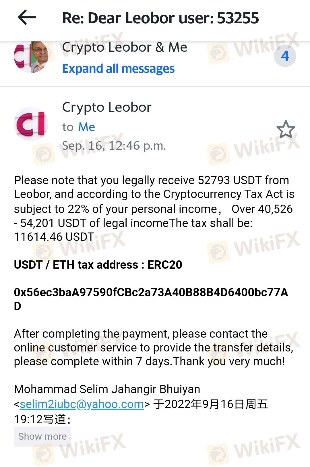 Tolong bantu aku. Saya menyetor dan berdagang dengan platform Leobor. Uang tumbuh dan saya menarik uang beberapa kali. Ketika saya berinvestasi lebih banyak dan perdagangan saya berjalan dengan baik maka masalah dimulai. Bersama ini saya lampirkan : 1. Siapa yang memperkenalkan saya dan menunjukkan jalannya 2. ID Leobor saya 3. Status akun 3. Chat dengan Leobor 4. Email terkait pajak. 5. Layar penarikan ditolak pendek. TOLONG BANTU SAYA. Sebagian besar investasi saya dari teman dan pinjaman pihak ketiga berbunga tinggi. Sekarang status sosial dan keluarga saya akan hancur. Saya punya dua pilihan: 1. Pulihkan uang ini melalui otoritas Anda atau 2. Bunuh diri untuk menghilangkan pelecehan dari pinjaman pihak ketiga dan situasi keluarga.