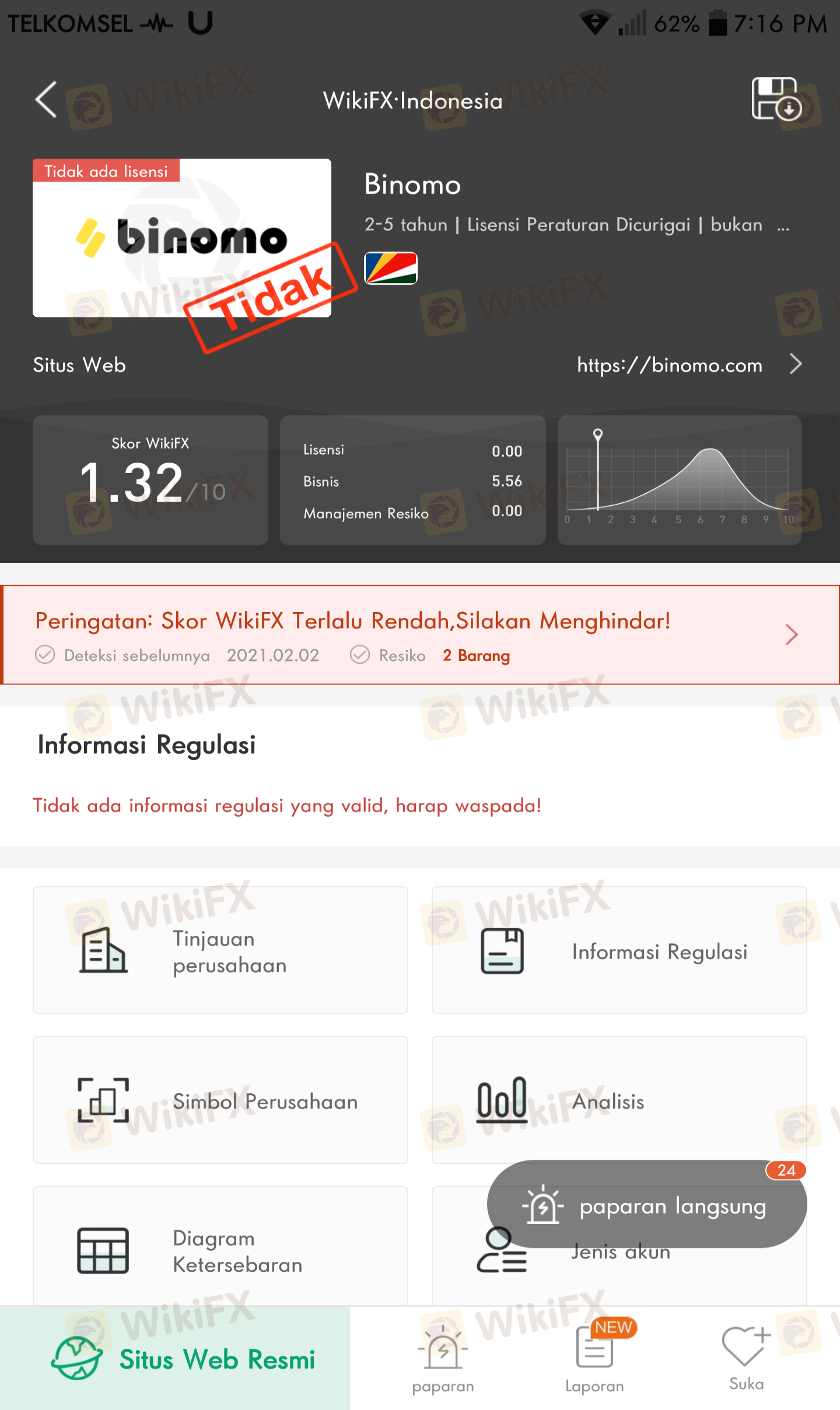 Itu mengapa Binomo mempunyai score rendah dalam aplikasi WikiFX karna tidak adanya izin regulasi dan BAPPEPTI sebagai badan pengawas di Indonesia yang dapat menyebabkan nasabah kesulitan dalam melapor apabila terjadi hal-hal yang tidak di inginkan.