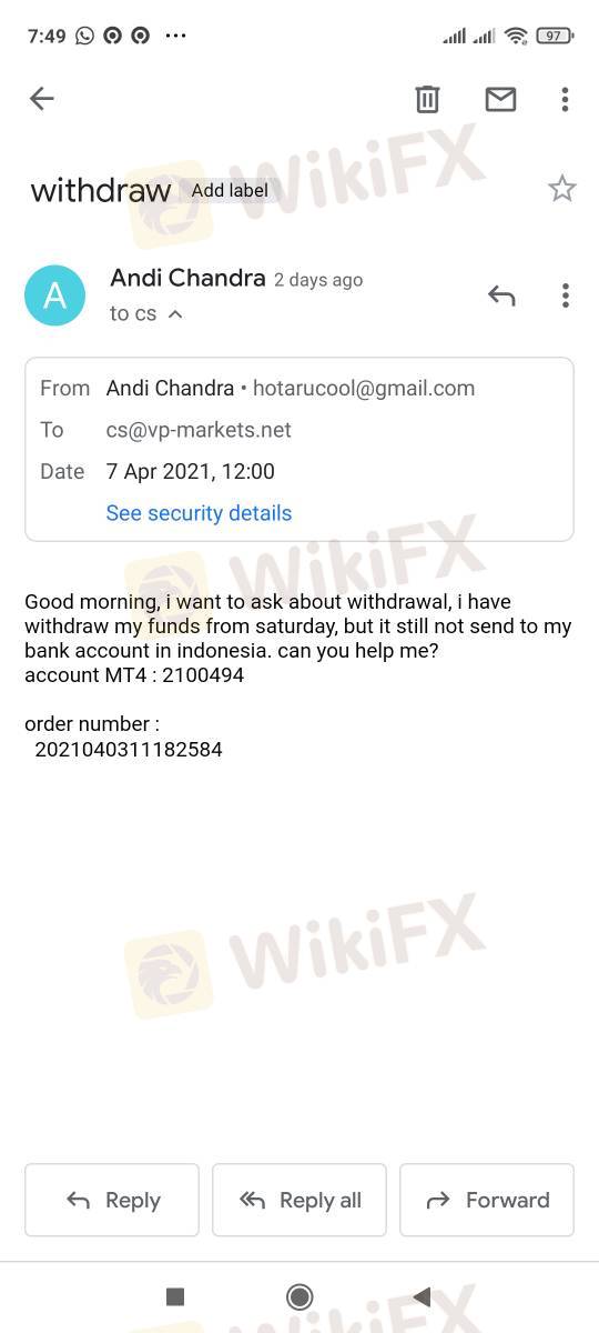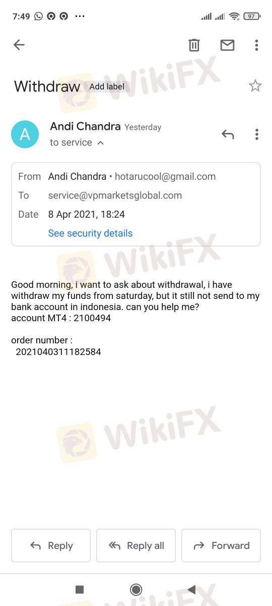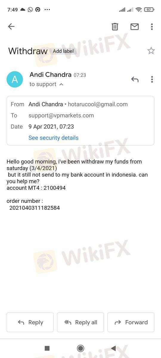 i've been withdraw my funds from saturday (3/4/2021) about $733 via wire but it still not send to my bank account in indonesia. i cant chat online with the CS and I've send an email to support service and other email but still no response. account MT4 : 2100494 order number : 2021040311182584