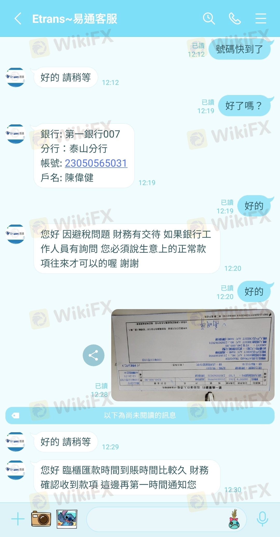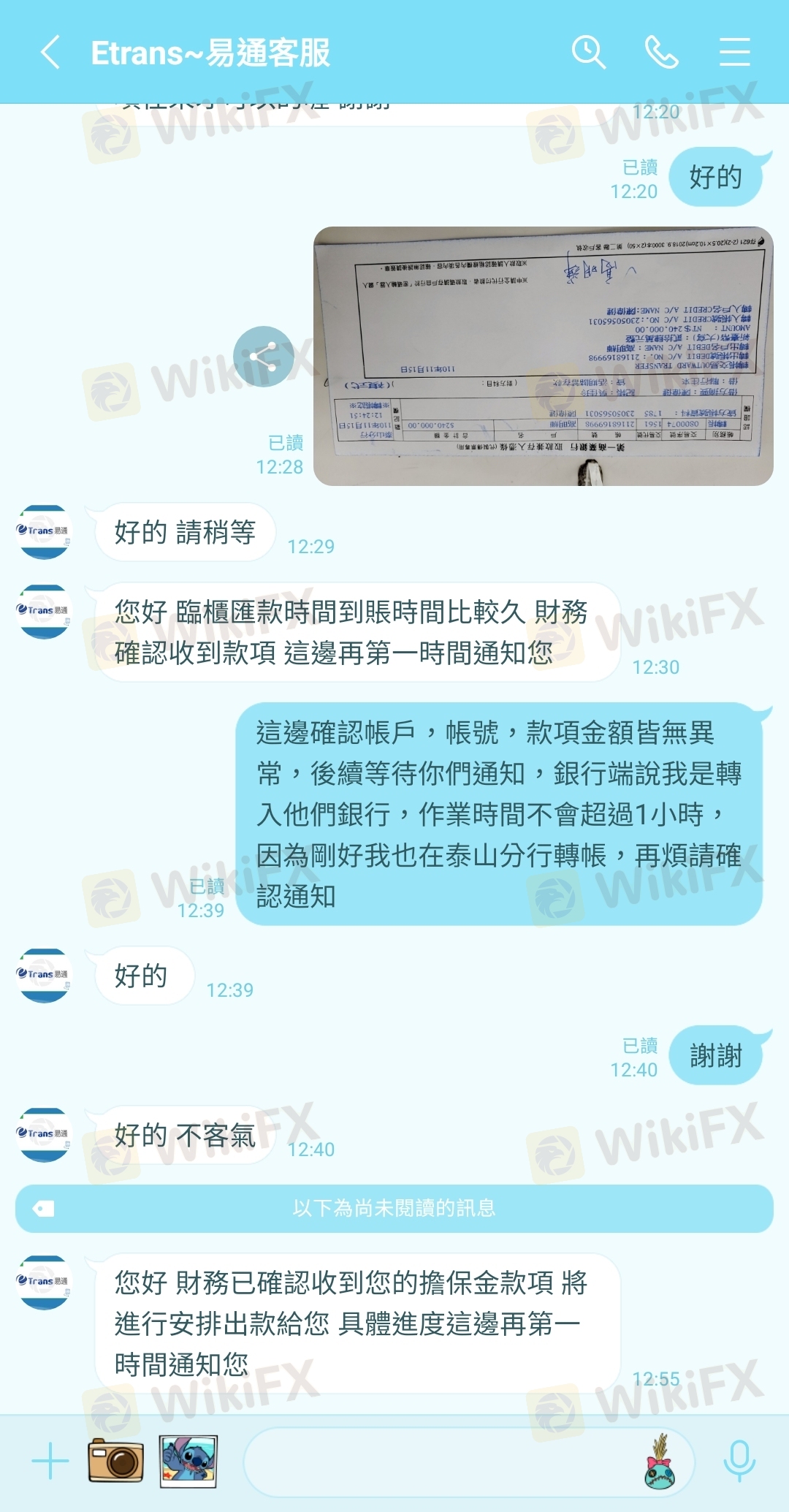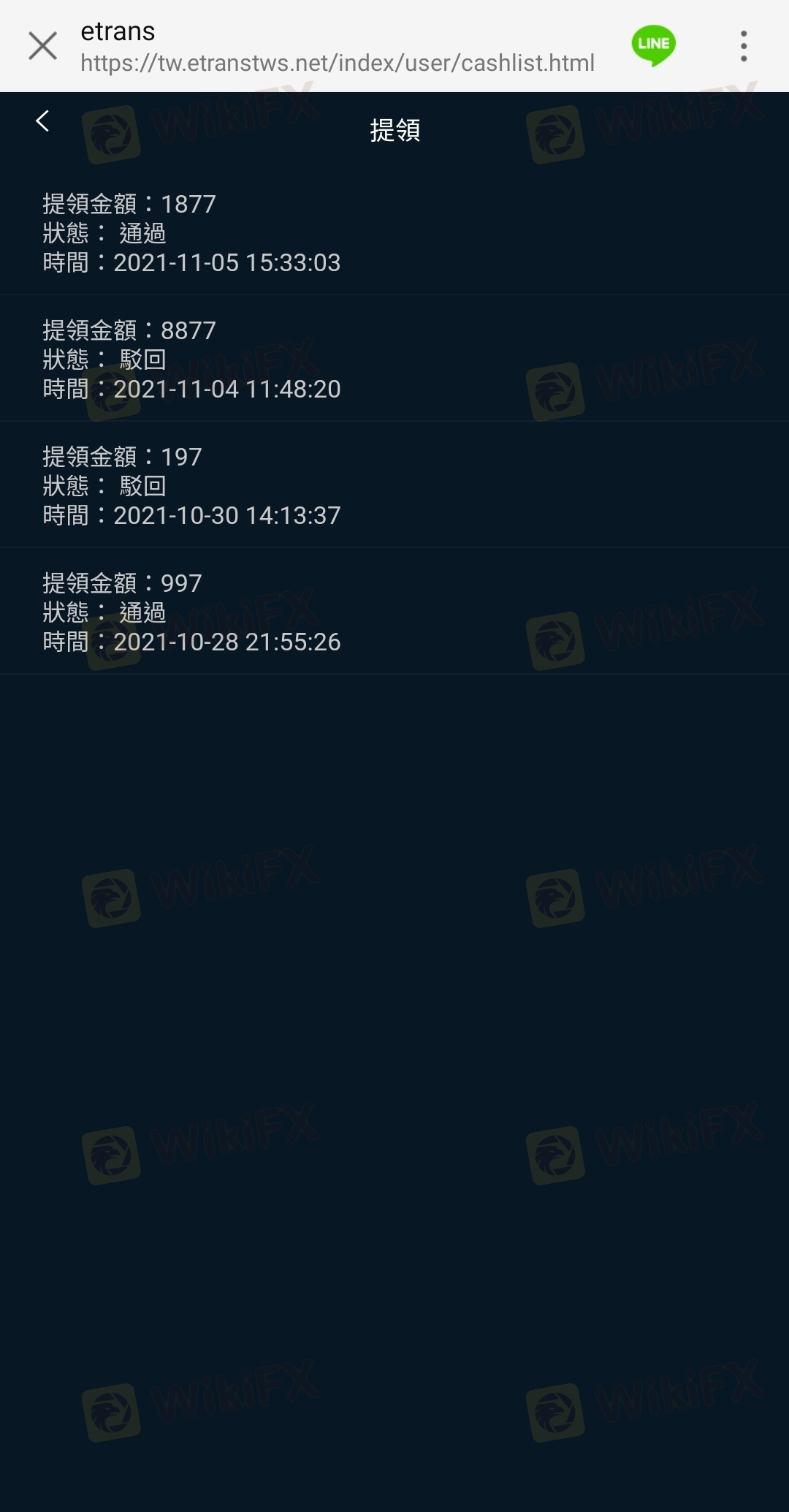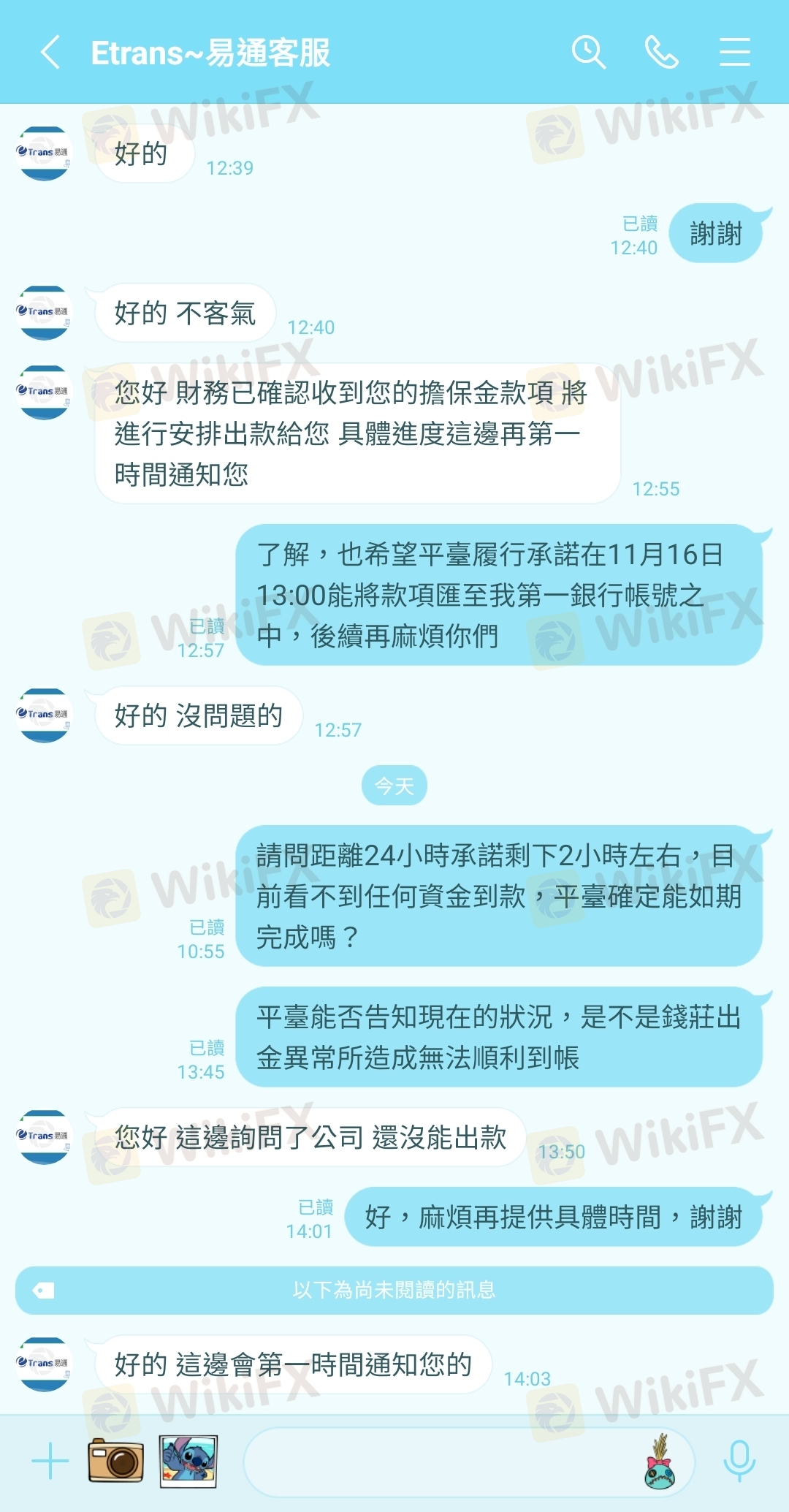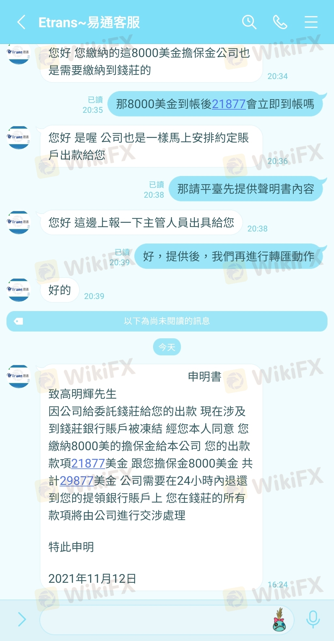 10/15開始使用平臺。 10/30向平臺提出VIP申請,申請核准後平臺才告知需要3000美金做保證。 11/04提供易通平臺3000美金會員費保證金。 11/04平臺告知帳戶轉出不了,需支付5000美金上報監管單位申請風險解除 11/05支付5000美金後,提出提領1877美金申請 11/06平臺仍無支付申請的1877美金提領,平臺方回應公司帳戶出現問題,暫時提領不了,回覆可能是帳戶問題需將資金提出,後面平臺高層主管私自決定由錢莊放款,從儲值帳戶直接提領走12000美金 11/07錢莊會計以未合作過帳戶,要求支付8000美金的確認金,8000確認金到帳後,24小時支付21877美金到我指定的金融帳戶 11/08完成支付8000美金,但錢莊於11/10透過平臺客服通知,我的出款被銀行拒絕,出款銀行要求錢莊及我本人各支付8000美金的擔保金才同意解凍錢莊帳戶 11/11與平臺協商若繳納8000美金的擔保金給平臺,後續錢莊帳戶問題,由平臺及錢莊自行處理,本日在錢莊呆滯的29877美金,平臺於支付後的24小時內,退還至我指定的帳戶,附上平臺申明書,11/15付款後至11/17無法出金甚至不回
