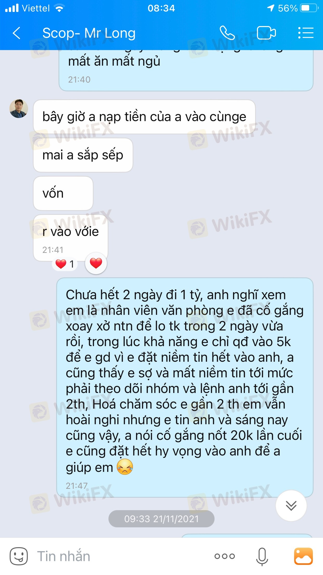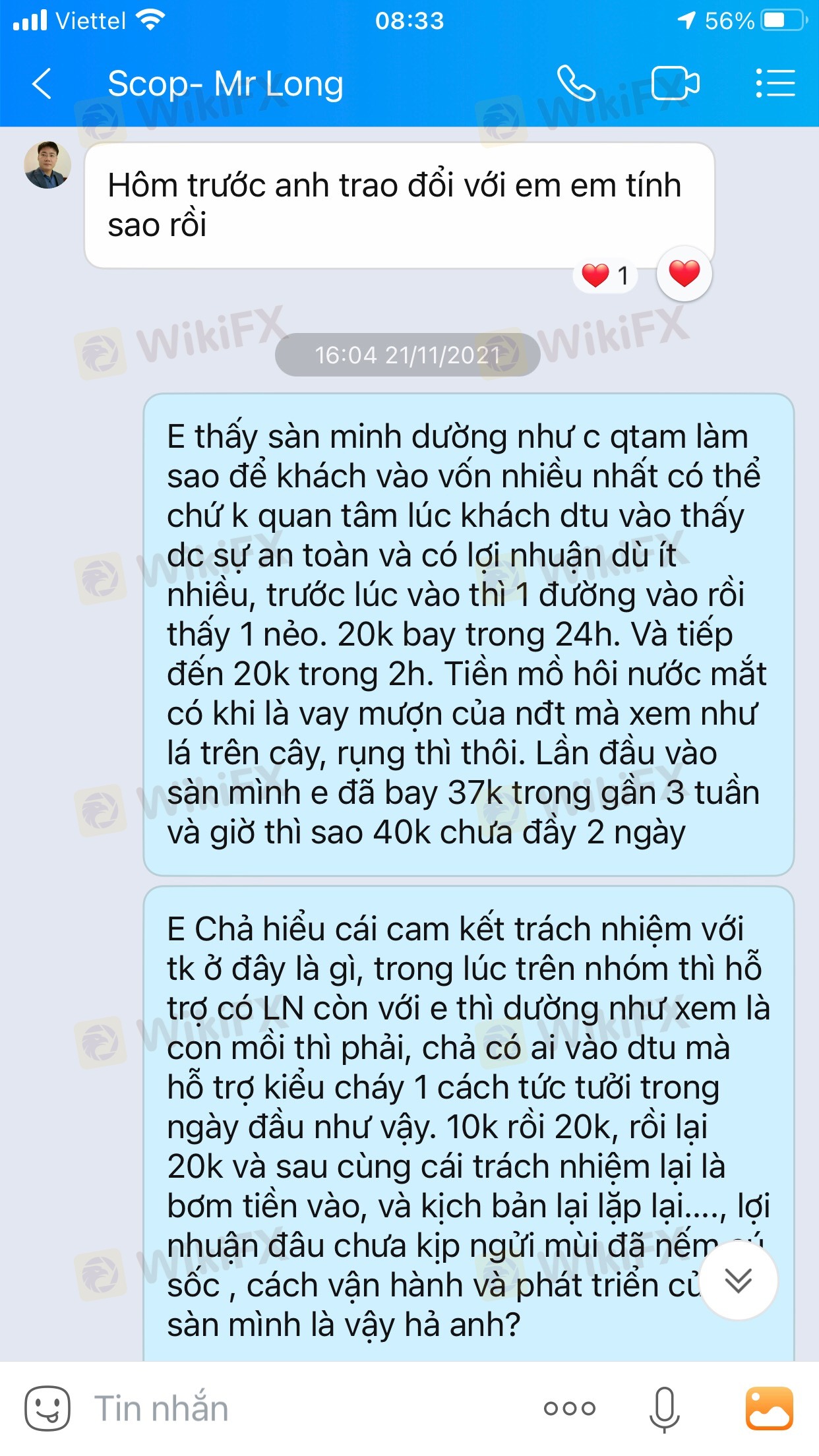 1. lần đầu hồi giữa T06/2021 sau khi nghe tư vấn của sale bên cty này, sau đó hỗ trợ giao dịch 1:1 ngày đầu có lợi nhuận cháy vào Tháng 7/2021 sau tầm gần 3 tuần với tổng số tiền nạp 37.000$ 2.Lần thứ 2 la 18/11 sau cả tháng cho tôi vào nhóm xem lệnh chuyên gia và các nđt giao dịch trên nhóm và hứa hẹn cam kết đt có lợi nhuận thì ngày và khi gặp sự cố bảo tôi nạp thêm để có suất bảo hiểm tk để back vốn cũ về, tôi nghe theo và kịch bản tiếp diễn, tổng số tiền nạp lên tới 110.000$ và cháy