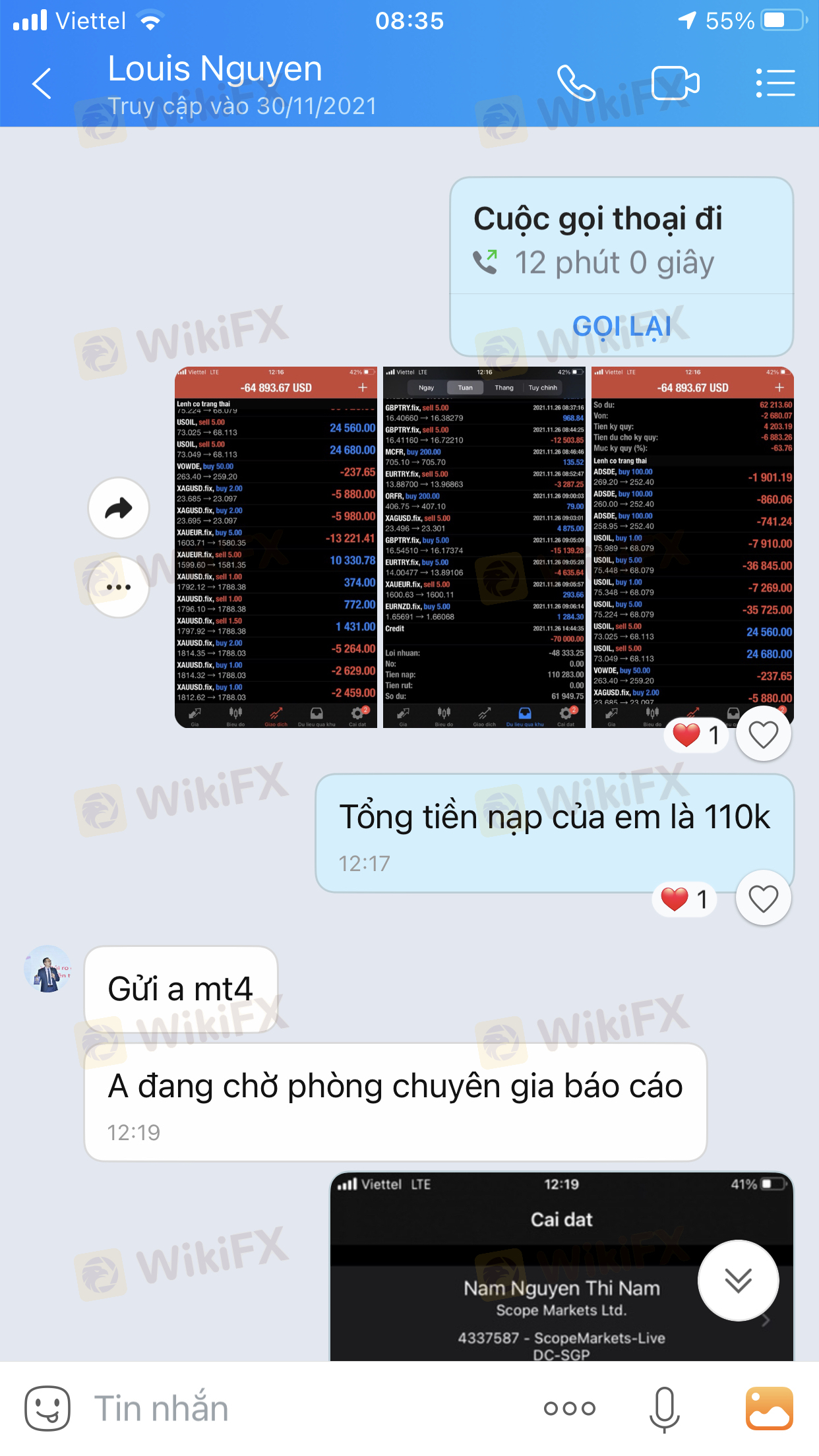 1. 2021年6月中旬にこの会社のセールスコンサルタントの最初のタイミングを聞いた後、3週間近く経った2021年7月の燃える利益の初日に1:1の取引をサポートし、合計預金額は37,000ドルになります。時間は11/18で、丸1か月後、グループに参加してグループの専門家の注文やトレーダーに会い、利益を上げることを約束するように頼まれますが、問題がある場合は預金するように言われます。古い資本を返すためのtk保険料があります。私はそれに従い、シナリオは続きました。保証金の総額は最大110,000ドルで、燃やされました。