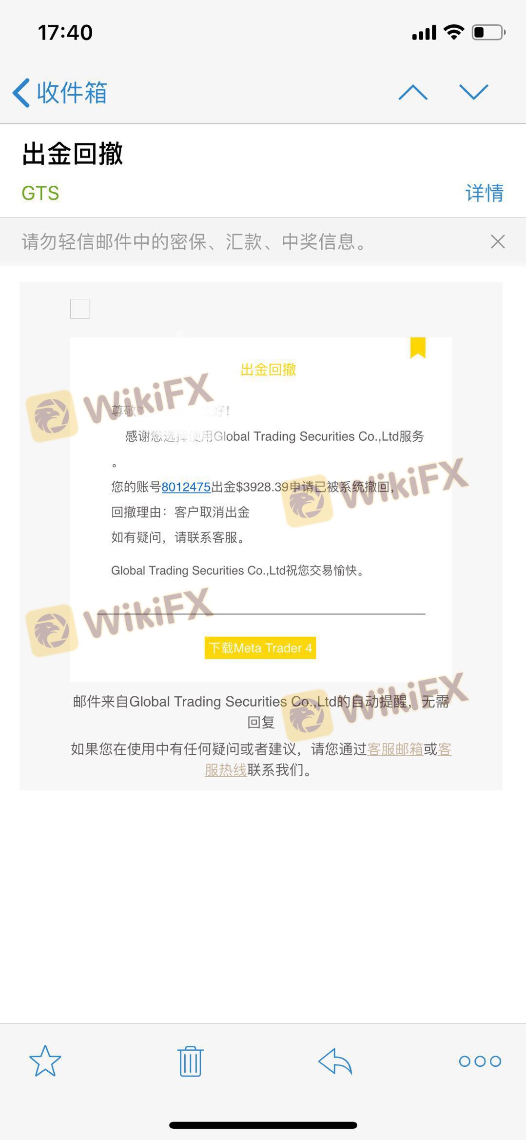 出金邮件,十月九号收到的,官网说3-5个工作日到账,但是到今天为止已经六个工作日,给客户经理打电话,被经理威胁说,如果警局备案,平台就不给出金。希望这个帖子发出去,能起到惊醒作用。九月二十八号出金,平台未经客户本人同意,私自给撤销了出金。
