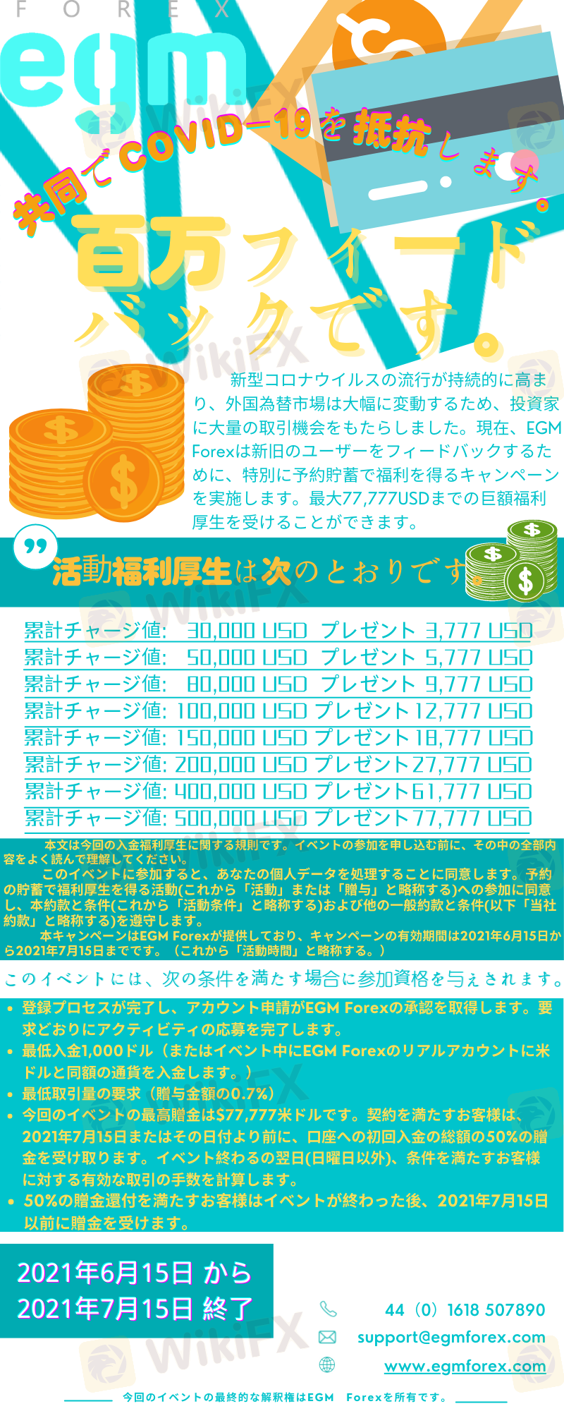 新型コロナウイルスの流行が持続的に高まり、外国為替市場は大幅に変動するため、投資家に大量の取引機会をもたらしました。現在、EGM Forexは新旧のユーザーをフィードバックするために、特別に予約貯蓄で福利を得るキャンペーンを実施します。最大77,777USDまでの巨額福利厚生を受けることができます。 本文は今回の入金福利厚生に関する規則です。イベントの参加を申し込む前に、その中の全部内容をよく読んで理解してください。 このイベントに参加すると、あなたの個人データを処理することに同意します。予約の貯蓄で福利厚生を得る活動(これから「活動」または「贈与」と略称する)への参加に同意し、本約款と条件(これから「活動条件」と略称する)および他の一般約款と条件(以下「当社約款」と略称する)を遵守します。 本キャンペーンはEGM Forexが提供しており、キャンペーンの有効期間は2021年6月15日から2021年7月15日までです。(これから「活動時間」と略称する。)