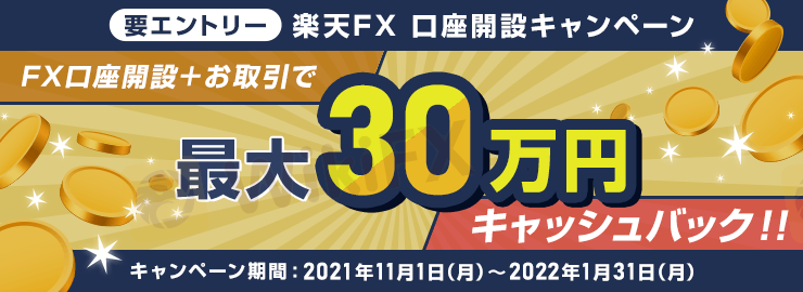 キャンペーン期間: エントリー期間:2021年11月1日(月)0:00~2022年1月31日(月)23:59 取引期間:口座開設月の翌々月末の最終営業日のニューヨーククローズまで 対象者: 楽天FX口座未開設のお客様 キャンペーン内容: ①本キャンペーンにエントリー ②キャンペーン期間中に楽天FX口座を開設する。 ③楽天FXの取引で取引数量に応じて最大30万円キャッシュバック ※楽天FXでお取引を開始するには専用口座が必要です。 ※既にFX口座を開設しているお客様は対象外となります。 ※FX口座開設前のエントリーも有効となります。 ※お取引は新規注文のみを対象といたします。決済注文は対象外です。 ※注文が成立した時点で、お取引とみなします。注文中の注文は含まれません。 ※キャンペーン期間における対象通貨ペアのお取引の合計で付与金額を算出いたします。 対象通貨ペア: 楽天FXで取引可能なすべての通貨ペア 特典付与時期: FX口座を開設した月の3ヶ月後予定(対象となるお取引期間終了月の翌月下旬) 【2022年2月付与】 取引期間:2021年11月1日(月)7:00~2022年2月1日(火)6:55 【2022年3月付与】 取引期間:2021年12月1日(水)7:10~2022年3月1日(火)6:55 【2022年4月付与】 取引期間:2022年1月3日(月)7:00~2022年4月1日(金)6:55