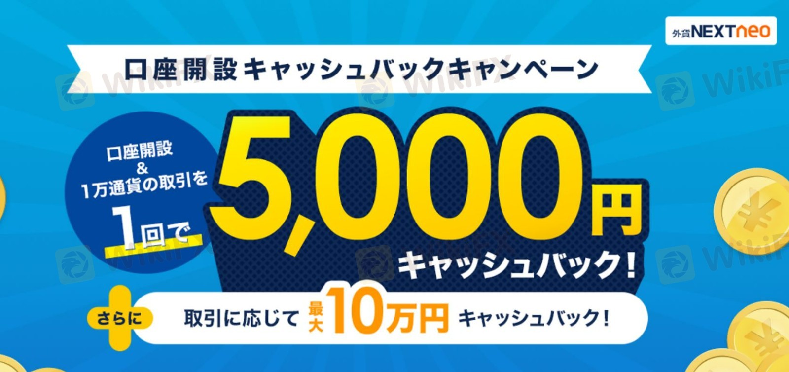 キャンペーン内容: 対象期間中にすべての条件を満たした方へ、合計105,000円をキャッシュバック キャンペーン期間: 随時 キャンペーン適用条件: ①外貨ネクストネオに新規口座開設 ②口座開設キャッシュバックキャンペーンにエントリー ③外貨ネクストネオで1万通貨以上の新規注文のお取引1回で5,000円GET ④外貨ネクストネオにて新規注文のお取引で1,000円~100,000円GET キャンペーンの注意点: ①外貨ネクスト口座または外貨ネクストネオ口座を解約されたことのある方は対象外 ②キャンペーンのエントリーが必要