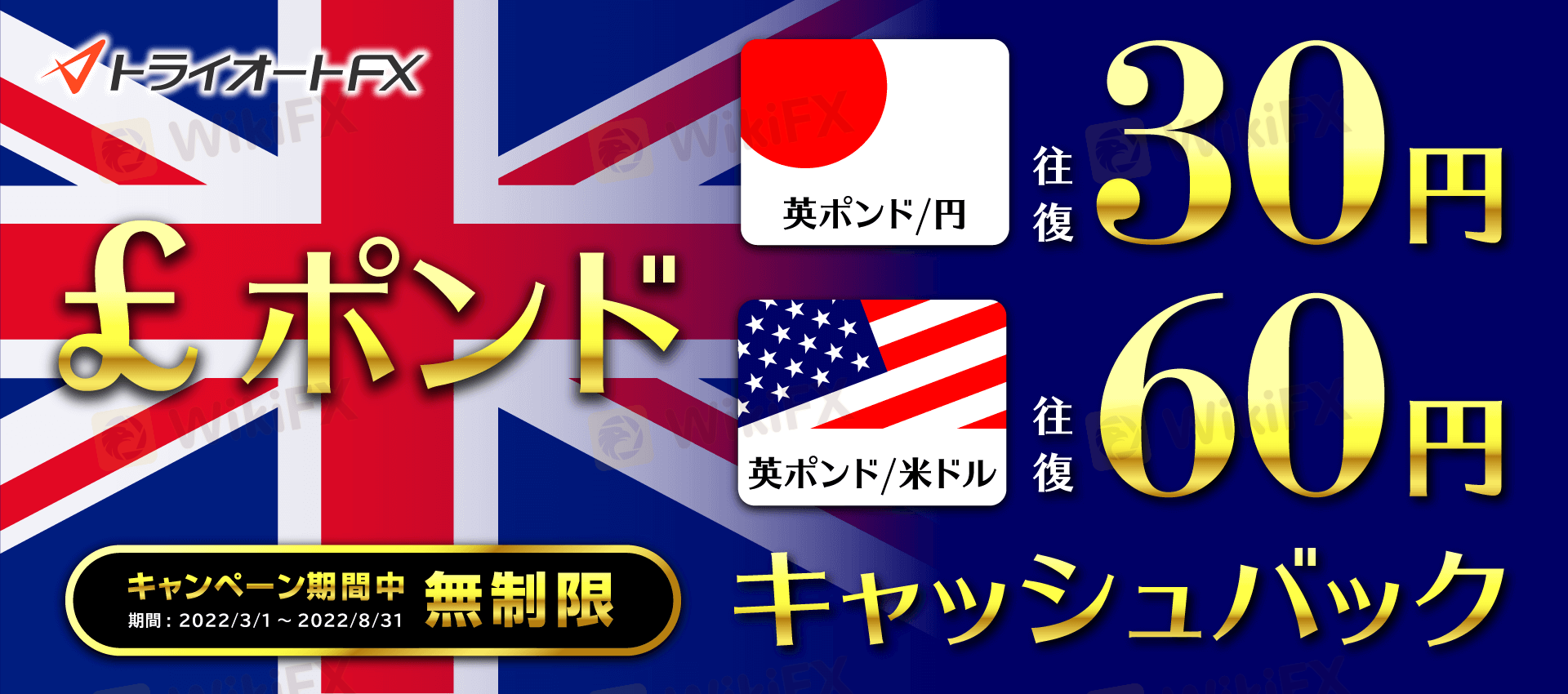 【キャンペーン期間】 2022年3月1日(火) ~ 2022年8月31日(水) 【対象のお客さま】 キャンペーン期間中に応募フォームからお申込みを行ったお客さま 【キャンペーン内容】 キャンペーン期間中、「ポンド/円」「ポンド/米ドル」のマニュアル取引において、新規または決済取引の約定で1万通貨あたり下記の金額を上限なしでキャッシュバックいたします! 対象通貨ペア 1万通貨あたりキャッシュバック金額 ポンド/円 15円 ポンド/米ドル 30円 ※(ポンド円の場合)1万通貨あたり新規取引で15円、決済取引で15円がキャッシュバックとなります。 ※1万通貨あたり新規取引/決済取引は対象通貨ペアごとにカウントとなります。 ※自動売買取引による建玉をマニュアルで決済した場合は対象外となります。 ※ロスカットによる決済は対象外となります。 例えば マニュアル取引でポンド/円を新規50万通貨・決済50万通貨のお取引が約定した場合、1,500円をキャッシュバック! 【キャッシュバックについて】 対象期間 キャッシュバック期日 2022年3月1日(火)~3月31日(木) 2022年4月末まで 2022年4月1日(金)~4月29日(金) 2022年5月末まで 2022年5月2日(月)~5月31日(火) 2022年6月末まで 2022年6月1日(水)~6月30日(木) 2022年7月末まで 2022年7月1日(金)~7月29日(金) 2022年8月末まで 2022年8月1日(月)~8月31日(水) 2022年9月末まで ※月間のお取引ごとに集計して翌月にキャッシュバックいたします。 【キャッシュバックの確認方法】 トライオートFXの取引口座へ入金いたします。
