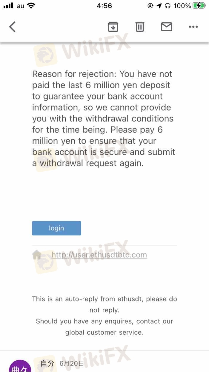 李詩文と言う台湾の女は勧誘役です。 Ethusdt は詐欺会社です。 お金を引き出す事が出来ません。 600万円引き出すためには、さらに600万円 支払えと言うメールを、送りつけて来ます。 以下のメールです。 Reason for rejection: You have not paid the last 6 million yen deposit to guarantee your bank account information, so we cannot provide you with the withdrawal conditions for the time being. Please pay 6 million yen to ensure that your bank account is secure and submit a withdrawal request again.