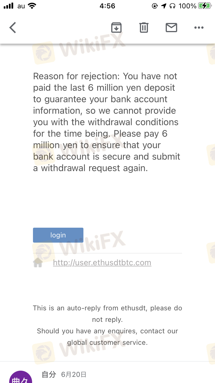 李詩文と言う台湾の女に騙された。 叔父さんは周其仁だと言い、LINEで紹介された。Ethusdt が指定した振り込み先が口座凍結したと、外貨為替監督とか風制御部門など訳が分からない話しをし始めた。 口座凍結された口座を警察、銀行に問い合わせた結果、詐欺事件として凍結された事が判明した。 警察に通告すると言うと、7月18日にアカウントを無効にされた。