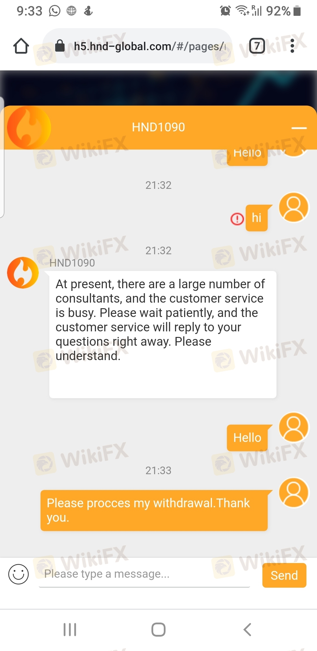 I was trading in this broker hnd-global.Fortunately no response for withdrawal account. I was deposit $ 1012 then made profit about $14000 .First withdrawal $100 was completed. then the next wtihdrawal was rejected. No response for customer service. And the price are not real.Bitcoin price not real market.When the normal price was down.this brokee btc price was going Up. Fake broker.Scammer.