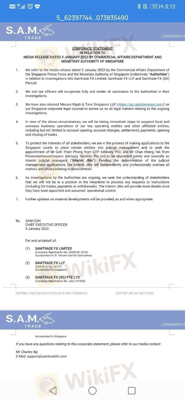 Ссылаясь на сообщение для СМИ от 3 января 2022 года Департамента коммерческих дел полиции Сингапура и Валютно-кредитного управления Сингапура (совместно именуемые «Власти») в связи с расследованиямиS.A.M. Trade FX Limited,S.A.M. Trade FX LLP иS.A.M. Trade FX (SG) Pte Ltd.S.A.M. Trade FX на данный момент прекратил все операции. поэтому мы не можем снимать средства. просить о помощи, потому что я домохозяйка и должна заботиться о 2 детях, которые еще учатся в школе. мои средства вS.A.M. Trade 20 000 долл. США