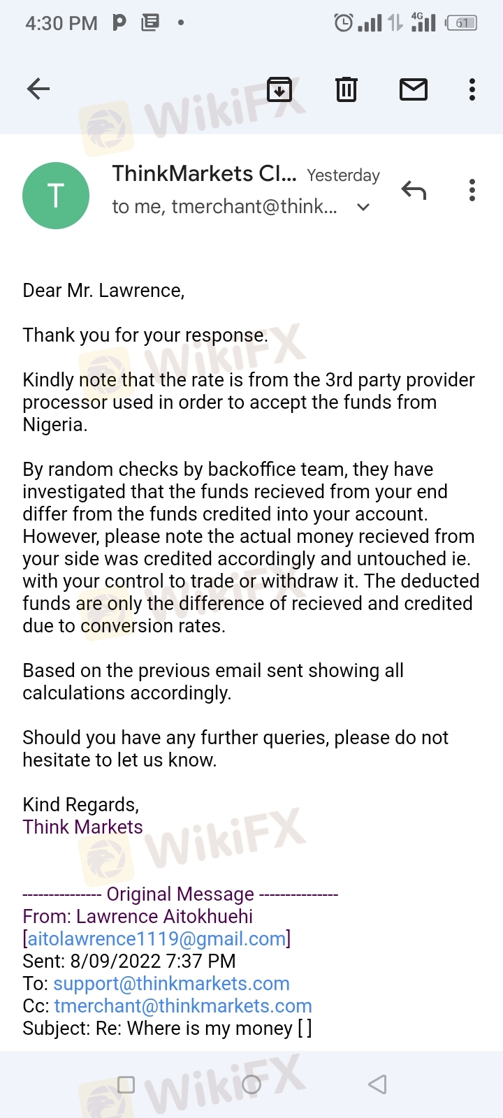 Dear Team, I am writing to solicit for your assistance. My Name is Lawrence Aitokhuehi from Nigeria. I was introduced into forex trading by a friend after some training I opened an account with thinkmarkets. Account Name Aitokhuehi Lawrence Account Number: 39069920 Broker: Thinkmarkets On their platform I was advised to fund my account via zotapay which I did with the provided rate of N420.32 to $1.00 on the platform while the central bank of Nigeria official rate was N420 to $1.00 I funded the account to the turn of $1,020 on the account and my Naira account was debited accordingly. I traded for about a month and made some loses and the balance on my trading account reduce to $720. On the 06/09/2022 I request for bank wire withdrawal of $520 to my bank account, on the thinkmarkets platform from the balance $720. The next day thinkmarkets suspend my account, withdraw all the funds and send me a mail that they have cleared my account to settle the difference in the conversion rate as at when the account was funded (attached are the mail). They also went further to state that the funds debited from my naira account by zotapay was not fully credited to them (mail also attached) They are saying the correct exchange rate that ought to have been used by Zotapay is N1,181.00 to $1.00. mail also attached. In the history of finance, USD/Naira rate has never exceeded N427 to $1.00 on our bank transactions. Zotapay is not responding to my mails sent to them since this whole thing stated May family is devastated because of this and the account officer assigned to me is no longer taking my calls and replying my chat. Please I need help to recover my funds as $700 is a lot of money in Nigeria Please let me know if you need any other information to assist me as I am in pain hear I need justice. Account Name Aitokhuehi Lawrence Account Number: 39069920 Broker: Thinkmarkets Kindly contact me