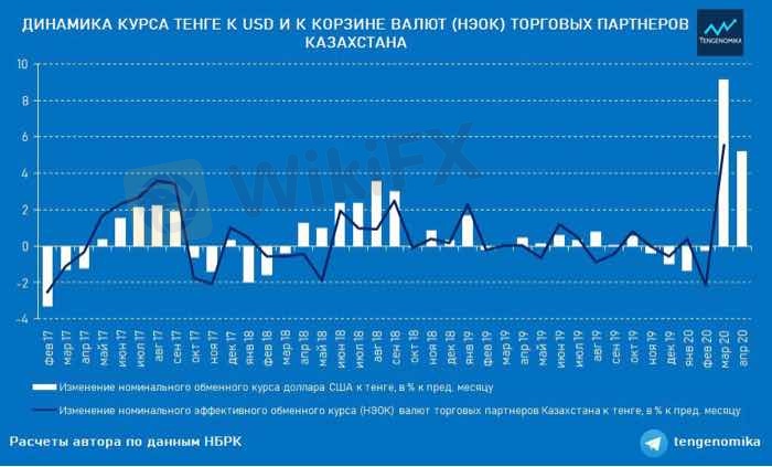 В целом направление и масштаб изменения НЭОК тенге и пары USDKZT может совпадать. Но в некоторые периоды они могут демонстрировать различную динамику. Так, летом 2017 года обесценение тенге к корзине валют торговых партнеров Казахстана (НЭОК) было сильнее, чем к доллару США. В мае 2018 года НОЭК тенге и вовсе укреплялся при падении нацвалюты к USD, а в феврале 2020 года при укреплении тенге к доллару США на 0,3%, укрепление НЭОК тенге составило 2,1%.