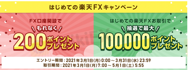 楽天証券では楽天ポイントのプレゼントキャンペーンを行っており最大最大10万ポイントはじめての楽天FXお取引で抽選で獲得できる可能性があります。FX口座開設すると対象者全てに200ポイントプレゼントなど楽天カードを利用している方にも嬉しいキャンペーンを行っています。