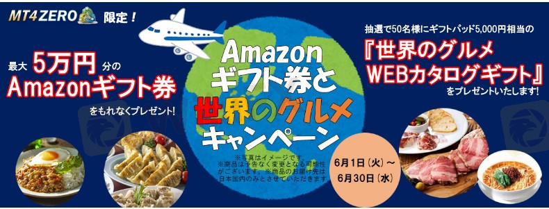 外為ファイネストが提供しているMT4ZEROでの取引限定で、期間中の決済取引ロット数に応じて、Amazonギフト券(最大5万円)のプレゼントを獲得可能。さらに、抽選で50人に世界各国の料理の中からプレゼントを選べる「世界のグルメWEBカタログギフト」(ギフトパッド、5,000円相当)ももらえるキャンペーン実施中。