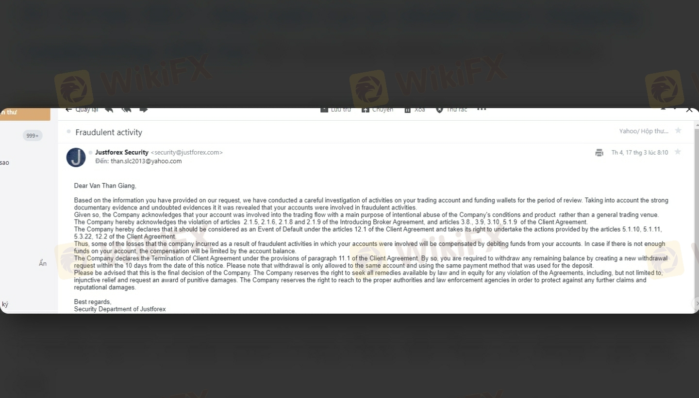 I am really dissatisfied with the way Justforex works. On 18 Feb 2021, they sent me an email about stopping cooperating with me for several reasons as follows I really don't understand why they did that, or what's going on. They asked for verification and I also did finish them, but they did not give any additional clear explaination and constantly accuse me After many times I emailed them to inquire about this problem but no hope. They created a fixed balance on my Mt4.