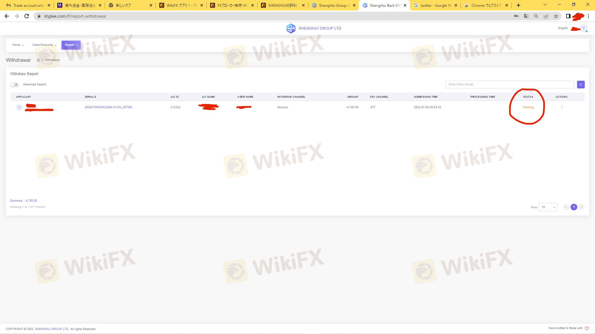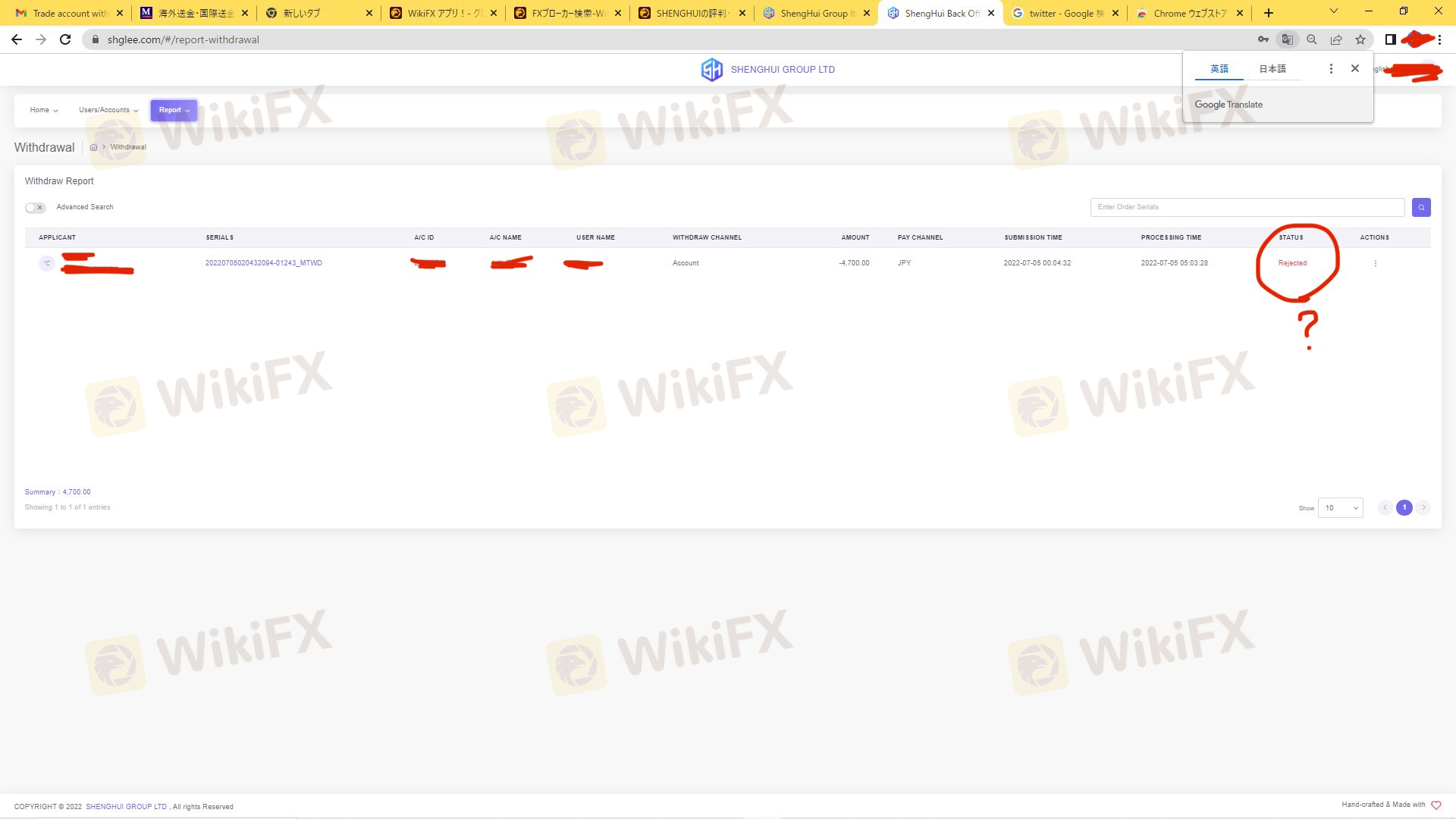 6月30日のボーナスキャンペーン終了後、日本語のサポート LINE:FX-Shenghui とコンタクトができなくなりました。 トークを送っても、既読もつきません。 そのような中、出金依頼をしましたが、出金拒否のメールがきました。 理由もないです。 HELP LINE にトークしても、何も返信ありません。 納得できません。 全額とは言わなくても、入金した分は出金させてください。