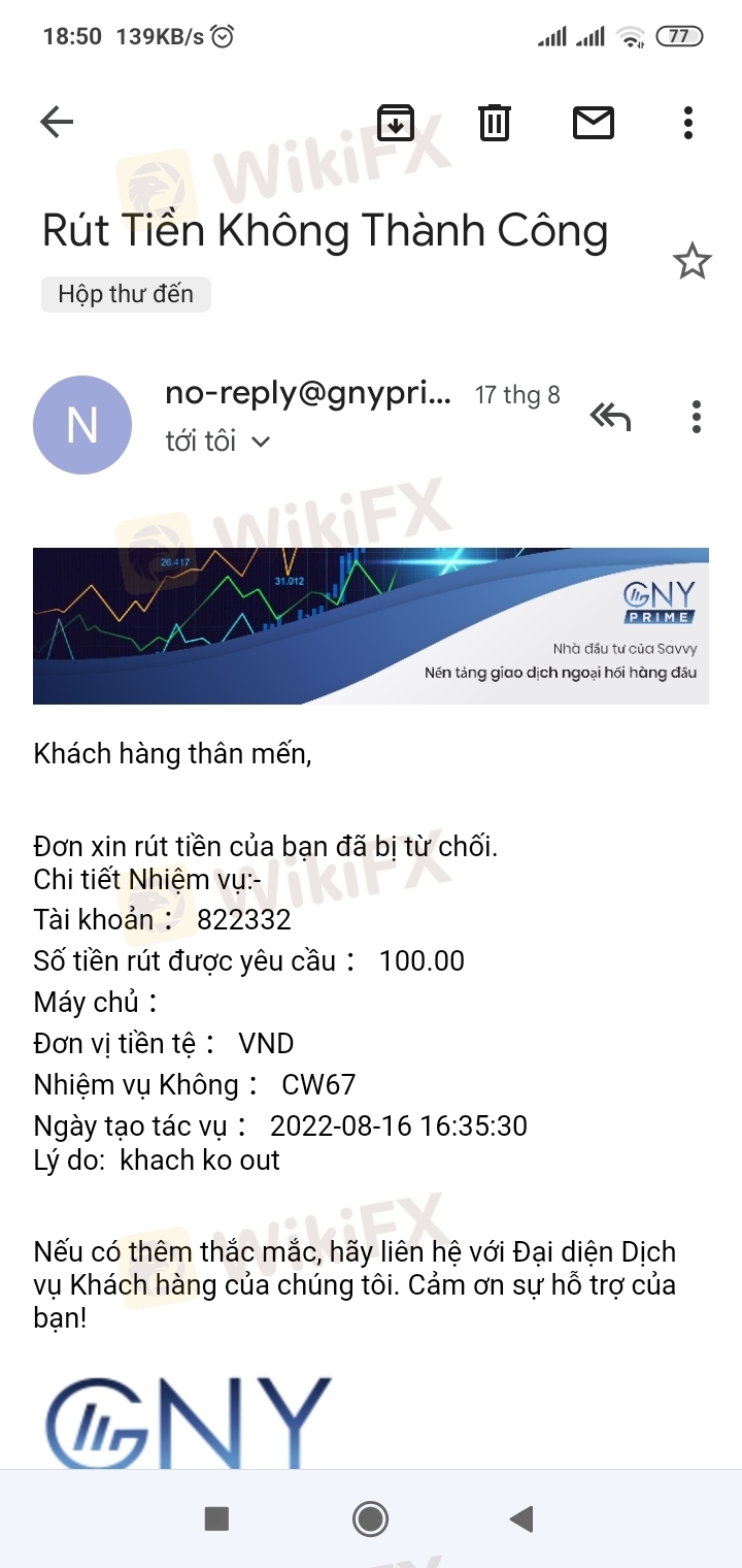 Sàn GNYprime-Live là một sàn lừa đảo. Sàn treo lệnh rút, từ chối rút tiền, tự ý can thiệp lệnh, cắt lệnh để giảm số tiền đầu tư. Đã thông báo đến môi giới mà vẫn không xử lý được. tài khoản của tôi là: ducthinhphatqt@gmail.com. tài khoản giao dịch trên MT5 là: 822332