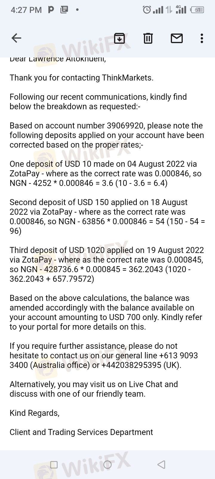 Dear Team, I am writing to solicit for your assistance. My Name is Lawrence Aitokhuehi from Nigeria. I was introduced into forex trading by a friend after some training I opened an account with thinkmarkets. Account Name Aitokhuehi Lawrence Account Number: 39069920 Broker: Thinkmarkets On their platform I was advised to fund my account via zotapay which I did with the provided rate of N420.32 to $1.00 on the platform while the central bank of Nigeria official rate was N420 to $1.00 I funded the account to the turn of $1,020 on the account and my Naira account was debited accordingly. I traded for about a month and made some loses and the balance on my trading account reduce to $720. On the 06/09/2022 I request for bank wire withdrawal of $520 to my bank account, on the thinkmarkets platform from the balance $720. The next day thinkmarkets suspend my account, withdraw all the funds and send me a mail that they have cleared my account to settle the difference in the conversion rate as at when the account was funded (attached are the mail). They also went further to state that the funds debited from my naira account by zotapay was not fully credited to them (mail also attached) They are saying the correct exchange rate that ought to have been used by Zotapay is N1,181.00 to $1.00. mail also attached. In the history of finance, USD/Naira rate has never exceeded N427 to $1.00 on our bank transactions. Zotapay is not responding to my mails sent to them since this whole thing stated May family is devastated because of this and the account officer assigned to me is no longer taking my calls and replying my chat. Please I need help to recover my funds as $700 is a lot of money in Nigeria Please let me know if you need any other information to assist me as I am in pain hear I need justice. Account Name Aitokhuehi Lawrence Account Number: 39069920 Broker: Thinkmarkets Kindly contact me