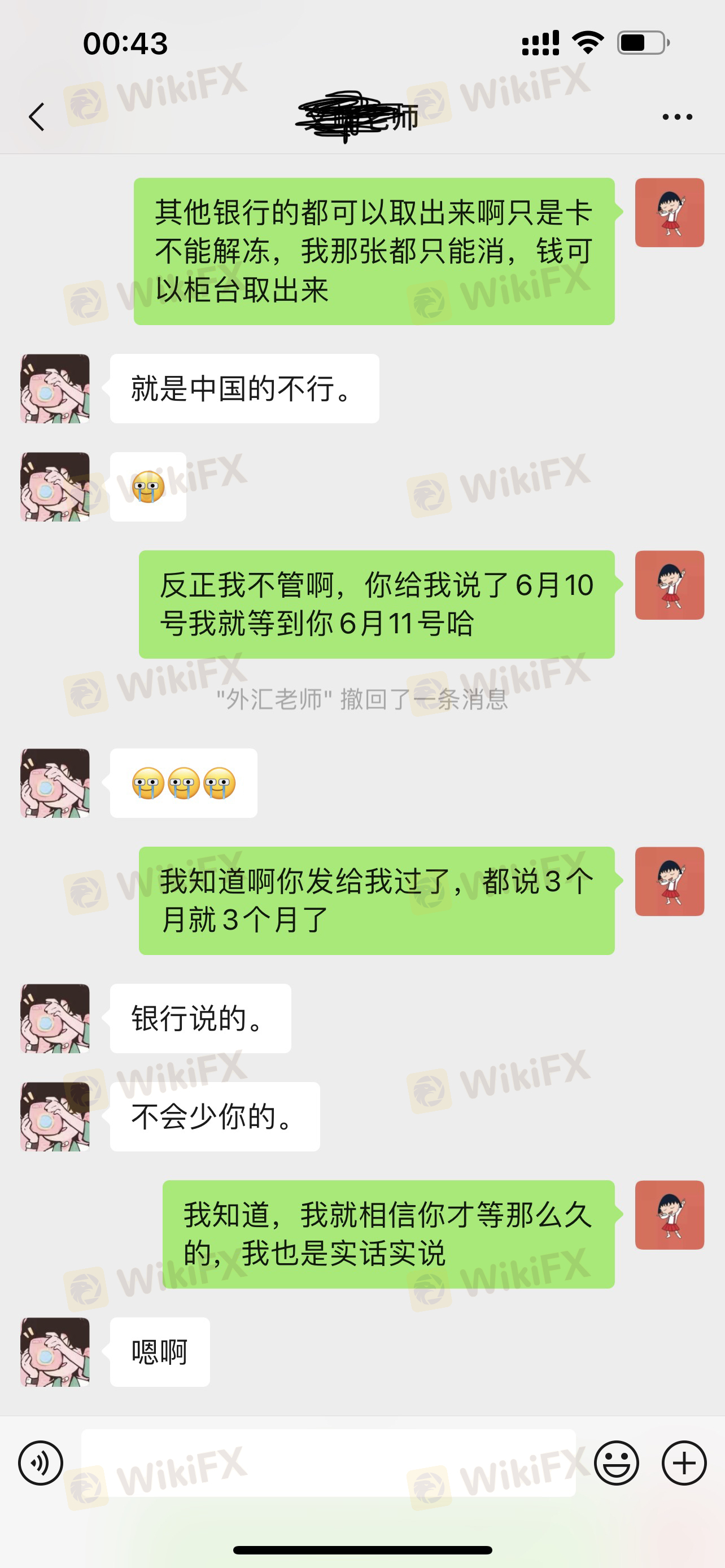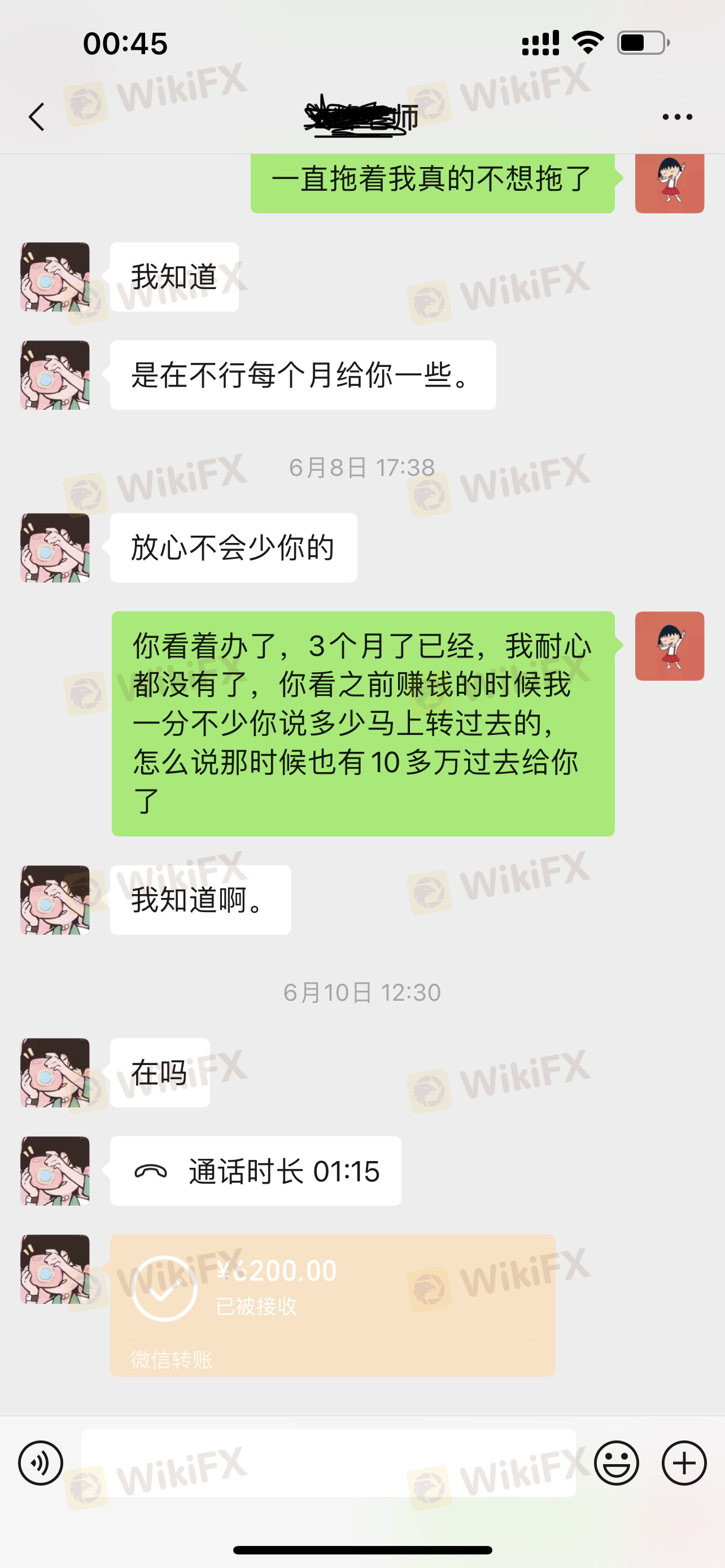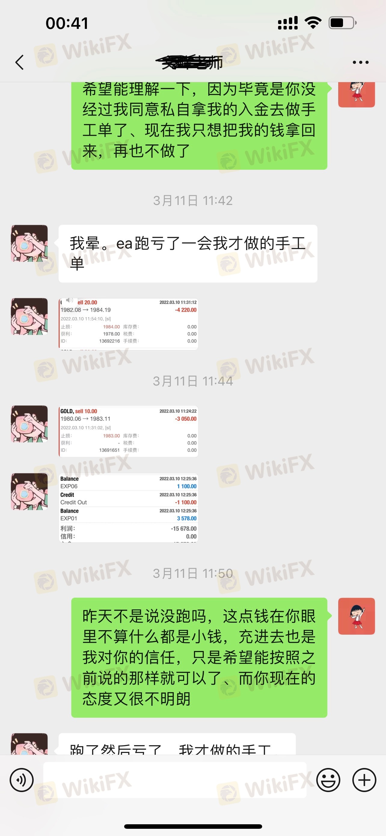 我是一个刚刚入行的小白,在网上结识了ex的客户经理,主动联系我带我下单,刚刚开始都是下的一手的,跟单两天后说帮我操盘,每次入金一万美金,然后下单一次下10手,20手,导致我的帐户爆仓了5-6次,最后一次我说不做手工单了想买ea自动系统来跑,他又说他有一个ea可以给我跑,也是55分利润,如果亏损了亏多少他赔给我多少。于是他在电脑端操作让我入金1.1万美金。但是我入金后,他说让我不要再打开帐户,因为ea跑着,怕我打开会影响后台运行,当天我都没有打开,到了晚上8点左右他打电话给我说我的账户又爆仓了!我马上打开mt4账户,发现我的账号资金变成了0而且也是被他下了手工单,一次下了10手导致爆仓的!我很气愤,要求他赔偿我的损失!他说会赔偿给我的,可是现在已经过去半年了,他只有前3个月赔偿了我一千美金,后面就以各种借口理由不赔偿了,到现在我急需用钱,他直接不回复不接电话了!而且收到ex邮箱信息显示说他已经离职!