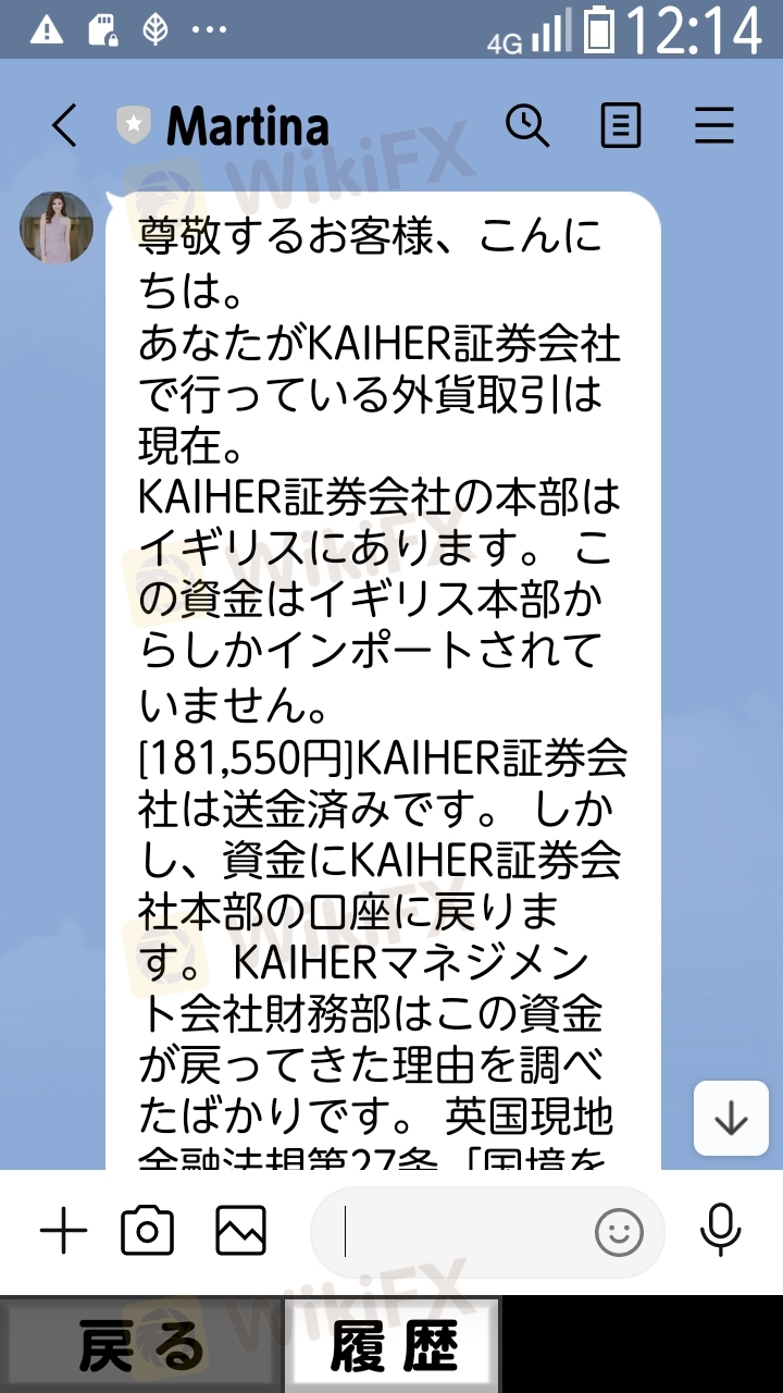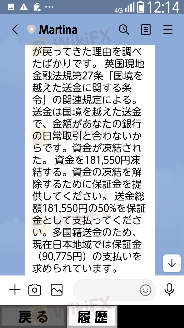 KaiherのMartinanマネージャーに出金拒否され、依頼して、出金したら、イギリスの国境を越えた送金で、資金が凍結され、50%の保証金の支払いを求められた。凍結された資金は181550円、保証金は90775円、凍結された資金と保証金の合計金額を支払うと、後から私の口座に入金するという。私は信用できないので、支払を拒否した。凍結された資金181550円が私に今も返金がない。Kaiherが言われるには、英国現地金融法規第27条国境を越えた送金に関する条令の関連規定。