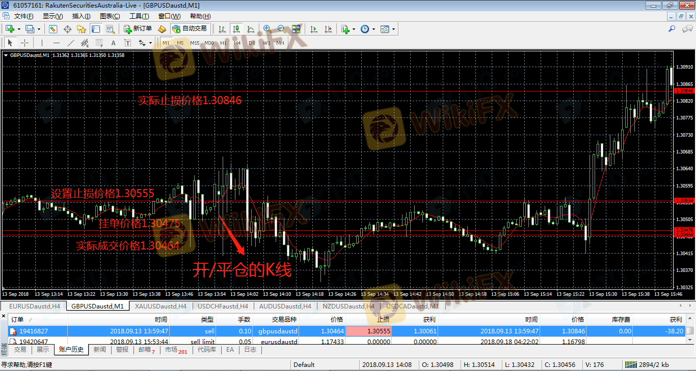 2018年9月13号13:59 我以1.30475挂的GDPUSD sell stop 空单,止损设置在1.30555,最终单子在13:59:47成交,又同时间13:59:47以1.30846的价格止损(此价格高于止损价格30个点,高于本时间段最高价17个点),在成交的瞬间加大点差,使得挂单成交和止损同时间完成。