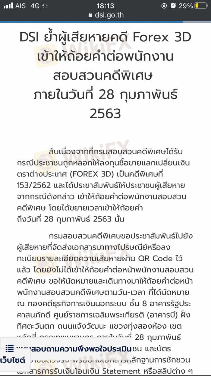 สืบเนื่องจากที่กรมสอบสวนคดีพิเศษได้รับกรณีประชาชนถูกหลอกให้ลงทุนซื้อขายแลกเปลี่ยนเงินตราต่างประเทศ (FOREX 3D) เป็นคดีพิเศษที่ 153/2562 และได้ประชาสัมพันธ์ให้ประชาชนผู้เสียหายจากกรณีดังกล่าว เข้าให้ถ้อยคำต่อพนักงานสอบสวนคดีพิเศษ โดยได้ขยายเวลาเข้าให้ถ้อยคำ