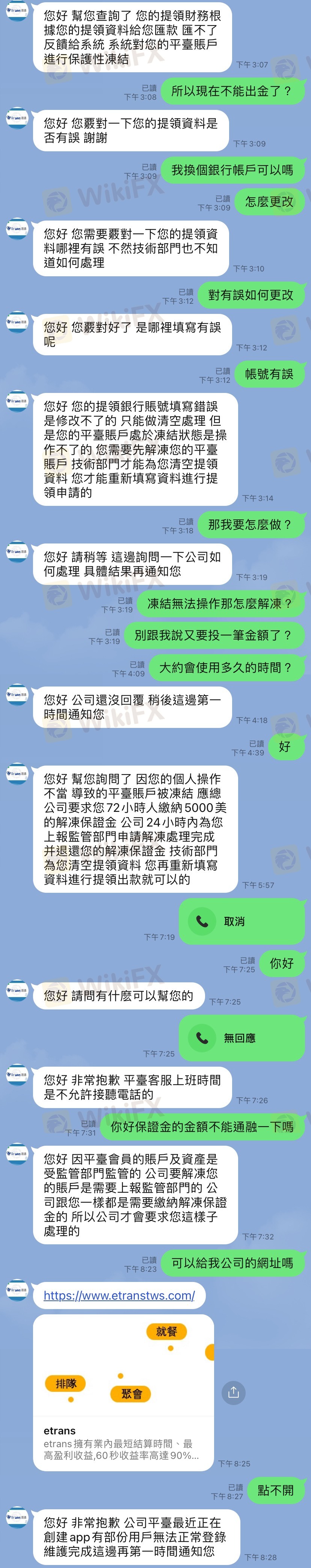 https://www.etranstws.com/該平台網址 網上的人叫我申請vip 問需要多少費用不錯直接幫我申請需要3000美才能解鎖帳戶 加值進去後我有確認過我有打對銀行帳號 我懷疑他更改了我了順序並跟我說我打錯帳號出不了金 需要5000美才能解凍帳戶 目前資金不足要在3天內繳交根本不可能